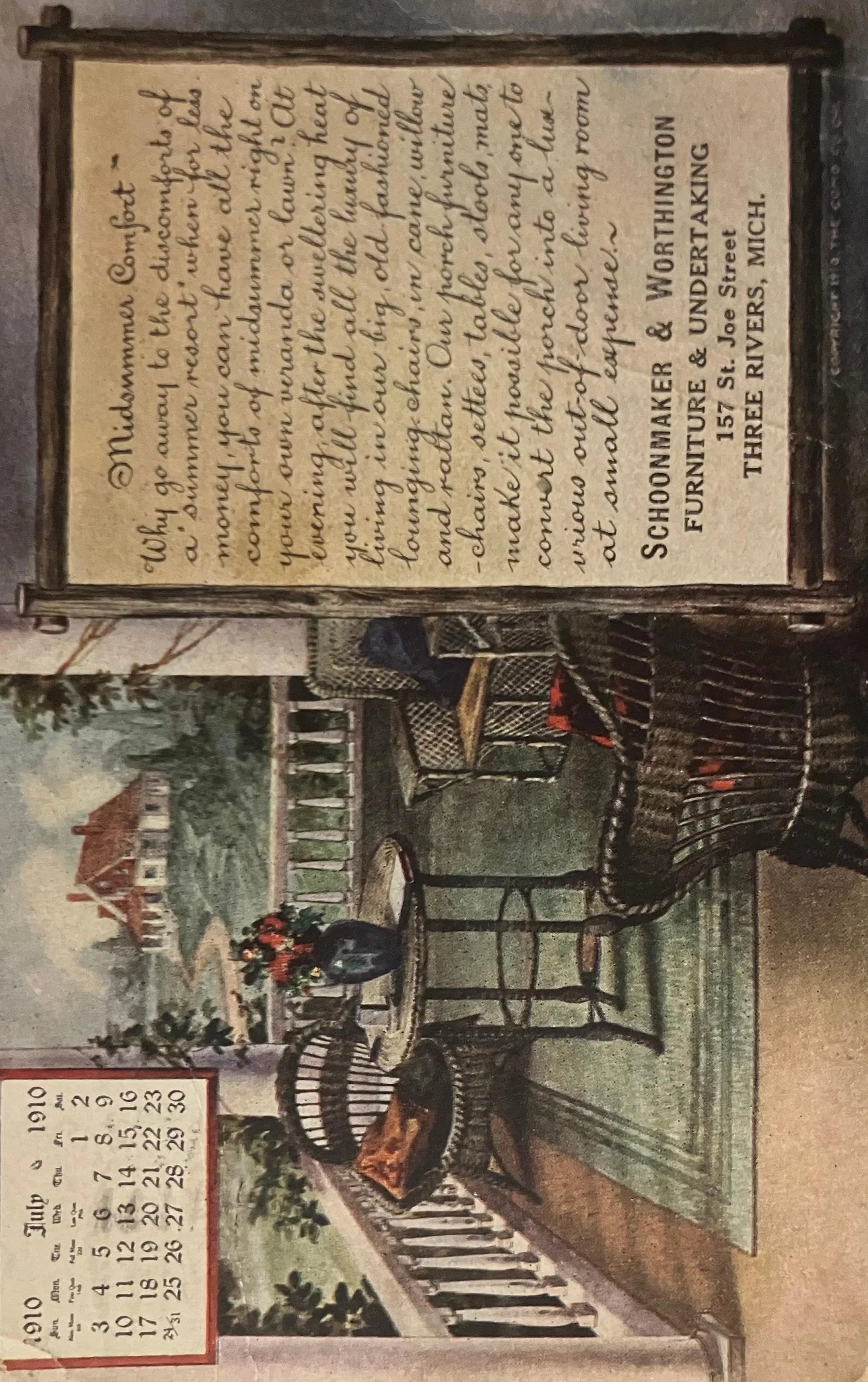 On front: Schoonmaker & Worthington Furniture & Undertaking 157 St. Joe Street Three Rivers, Mich. - Copyright 1910, The Como Co.