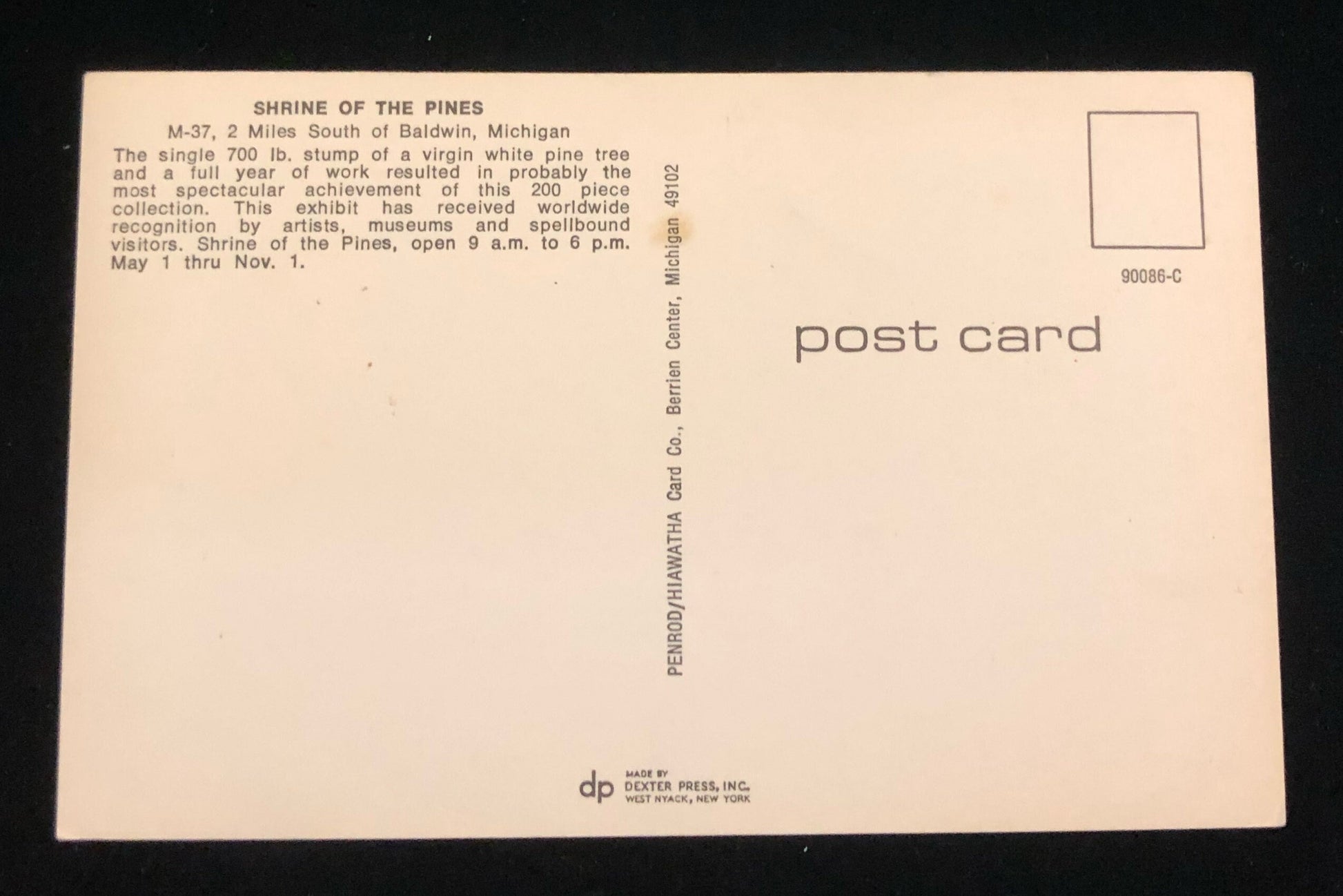 Back information: "M-37, 2 Miles South of Baldwin, Michigan. A cluster of white pine roots becomes an art object of rare, intricate beauty in the form of a chandelier. Raymond W. Overholser was the brilliant genius creator of the 200-piece collection. A priceless heritage of Michigan's lumbering era. Shrine of the Pines is open every day, 9 a.m. to 6 p.m. May 1 thru Nov. 1.