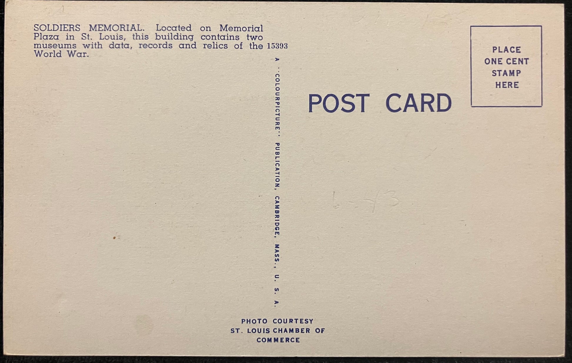 On back: SOLDERIS MEMORIAL. Located on Memorial Plaza in St. Louis, this building contains two museums with data, records and relics of the World War.