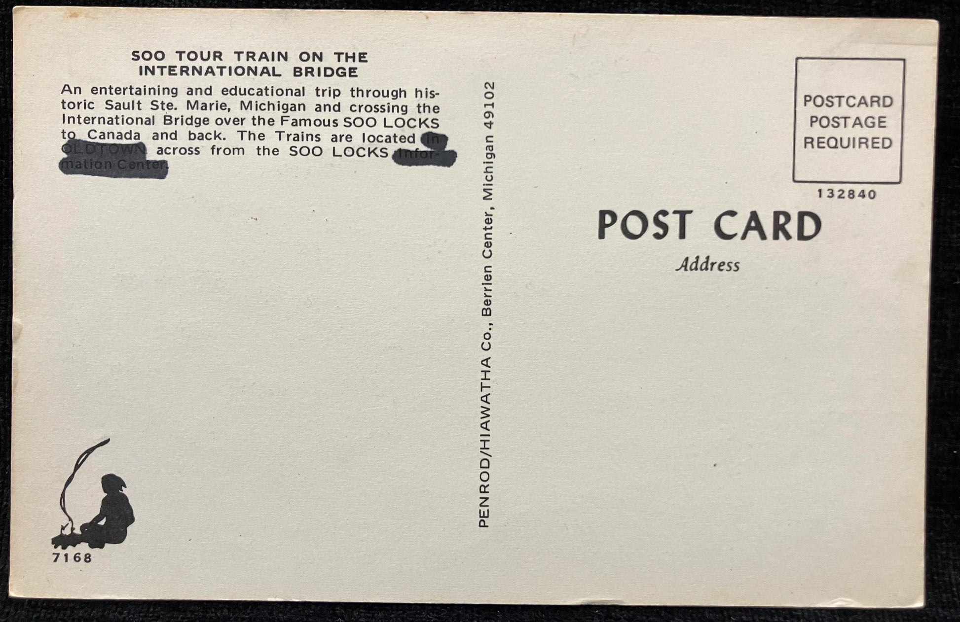Soo Tour Train on the International Bridge - Saul Ste. Marie, Michigan - Vintage Bridge Postcard