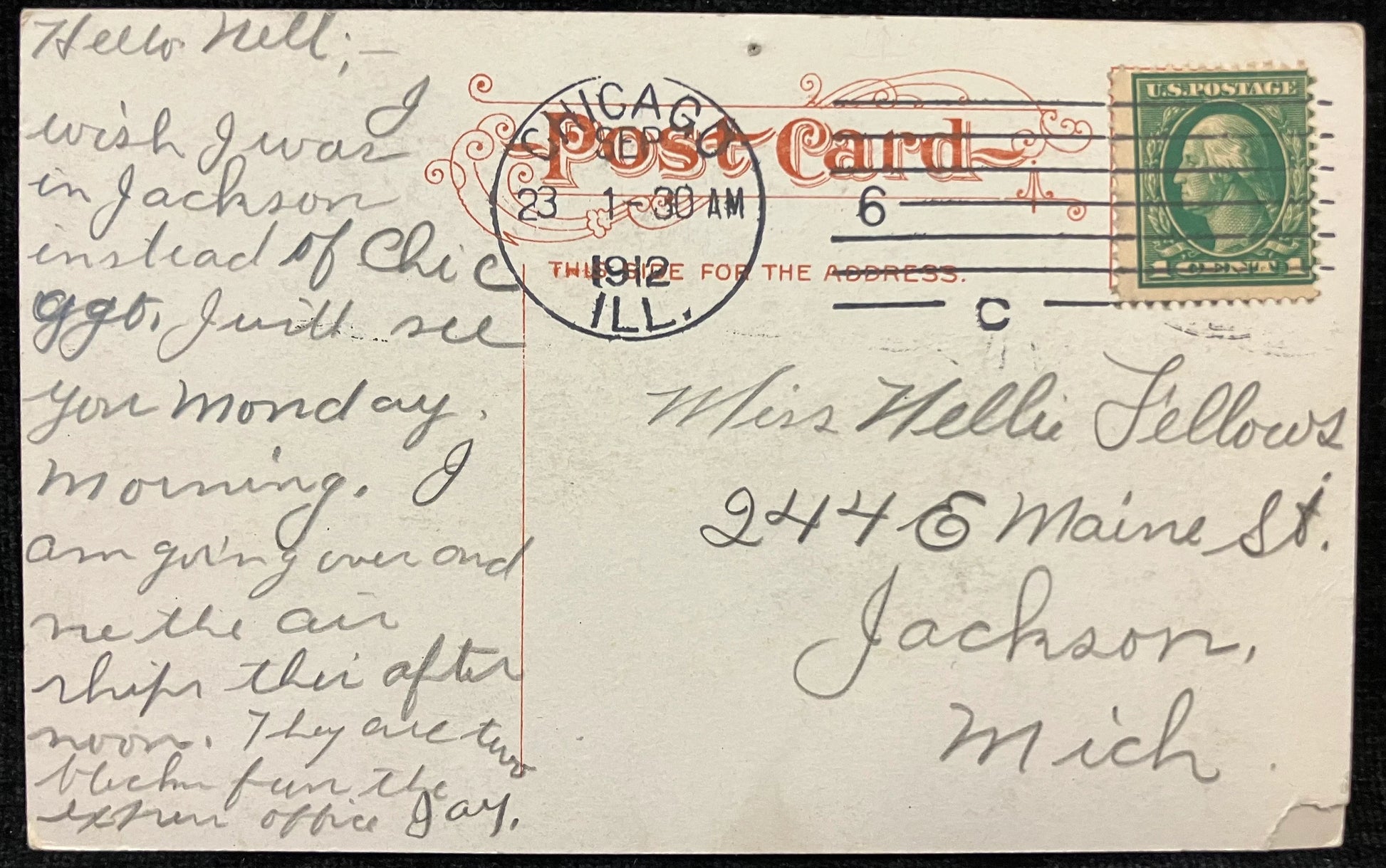 Mailed: Postmark: 1912 from Chicago, Ill. green one cent George Washington stamp