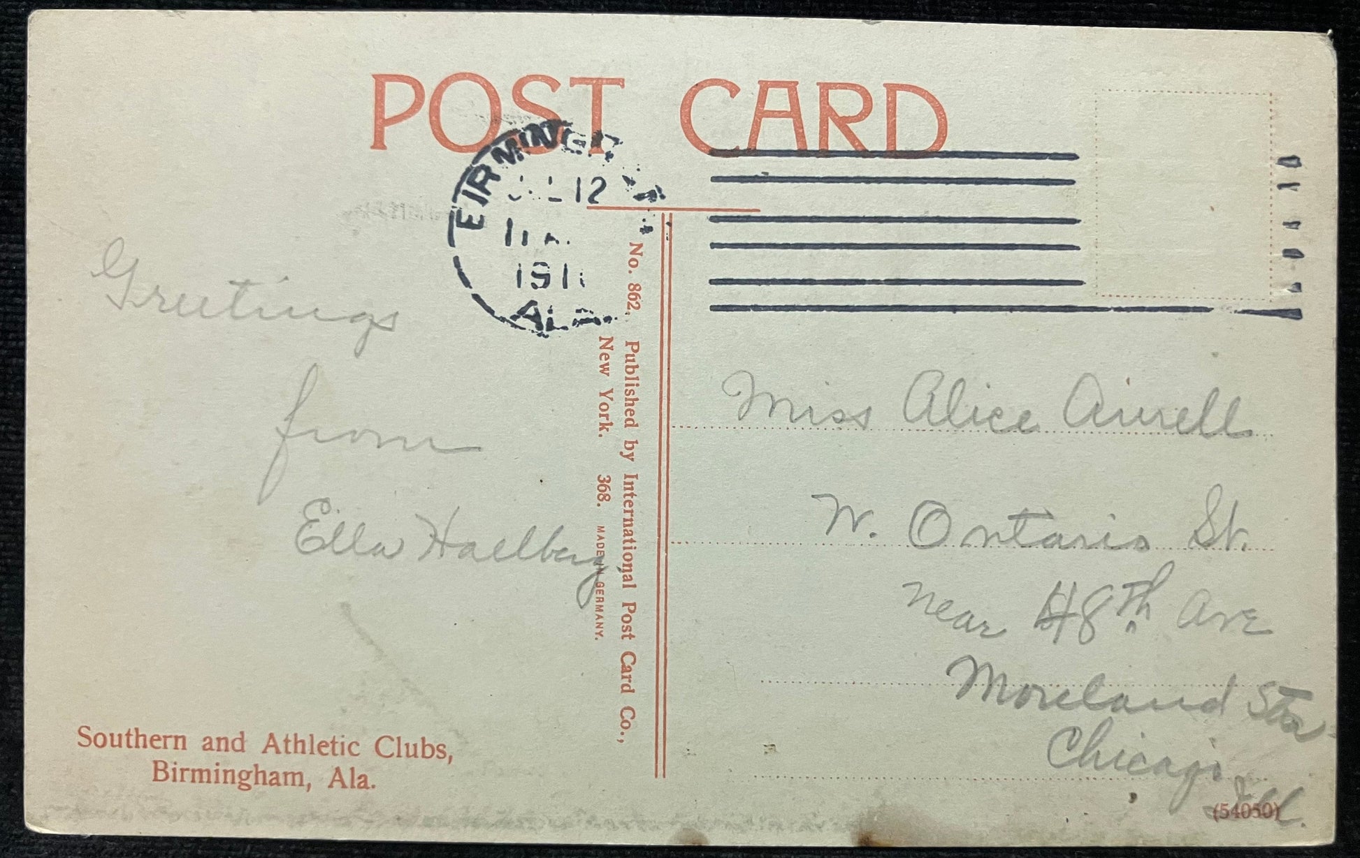 Mailed: Postmark on July 12, 1910 from Birmingham, Alabama, stamp missing