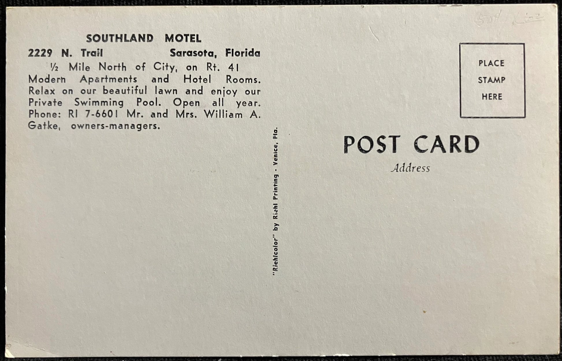 Back: SOUTHALND MOTEL N. Trail Sarasota, Florida 1/2 Mile North of City, on Rt. 41 Modern Apartments and Hotel Rooms. Relax on our beautiful lawn and enjoy our Private Swimming Pool. Open all year. Phone: RI 7-6601 Mr. and Mrs. William A. Gatke, owners-managers.