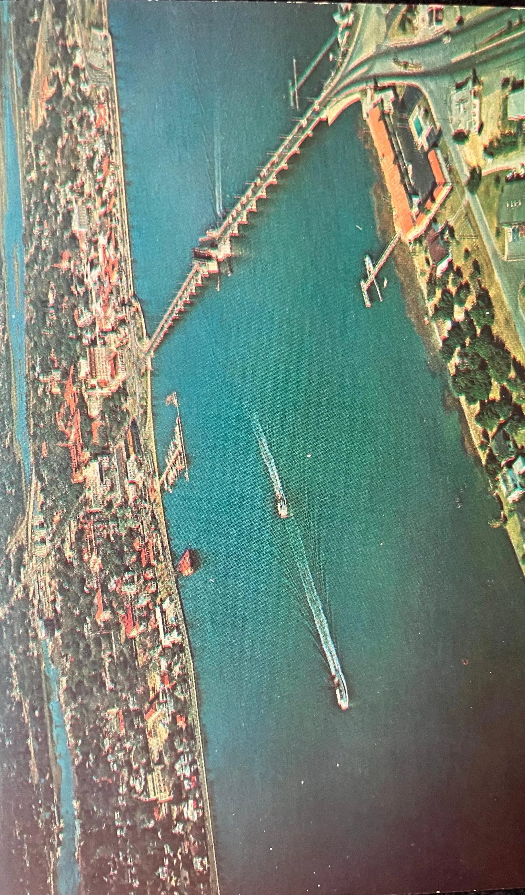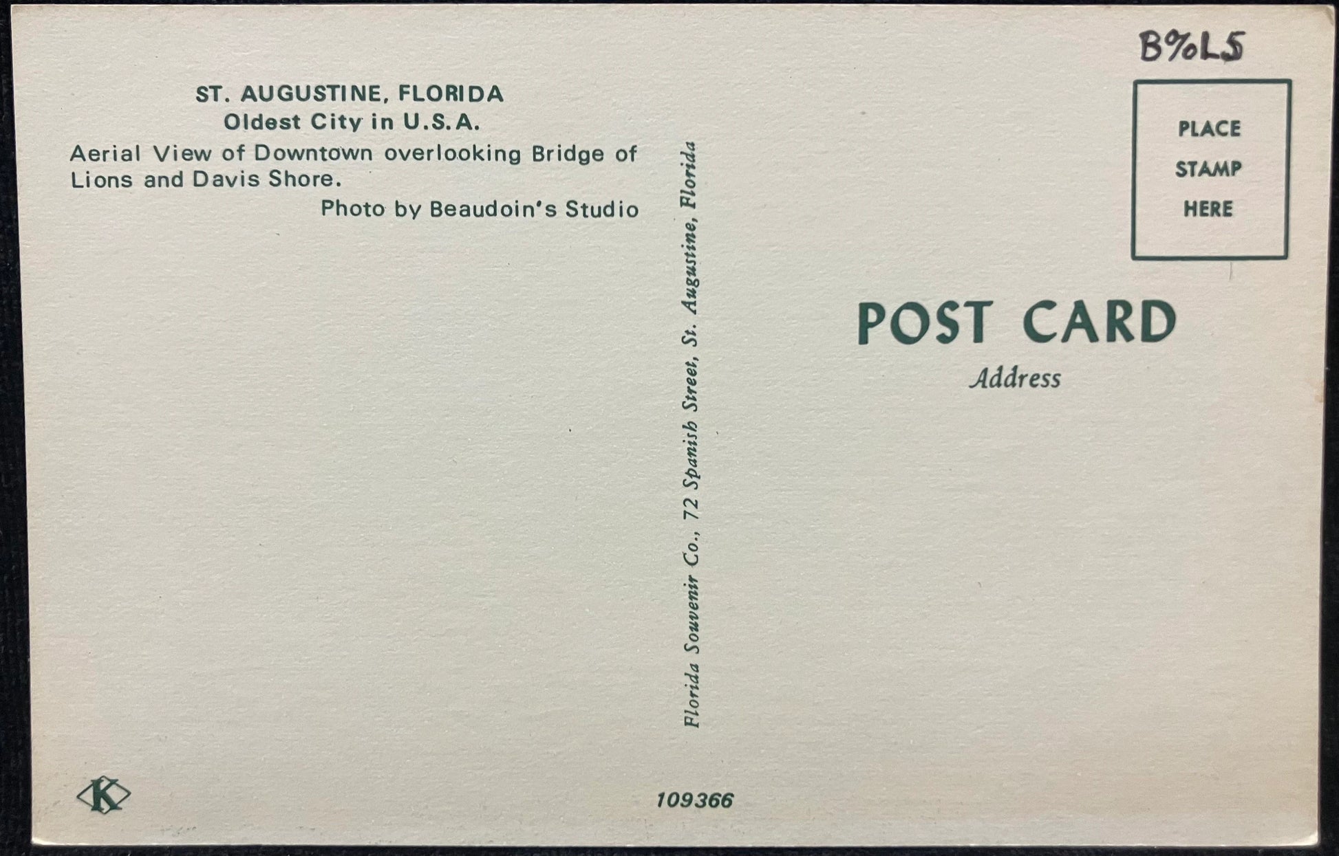 Back: ST. AUGUSTINE, FLORIDA Oldest City in U.S.A Aerial View of Downtown overlooking Bridge of Lions and Davis Shore.