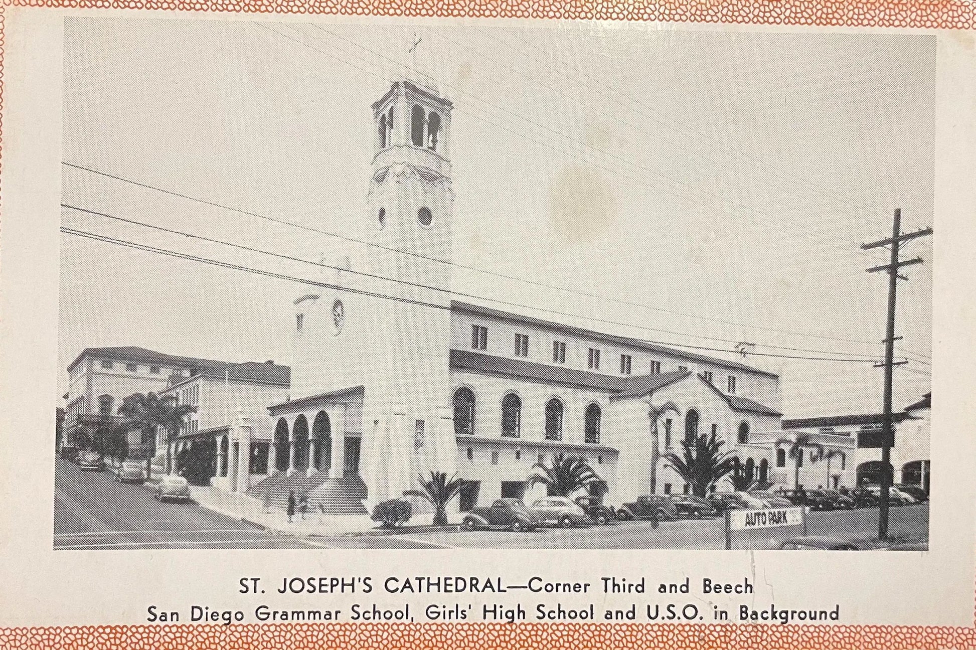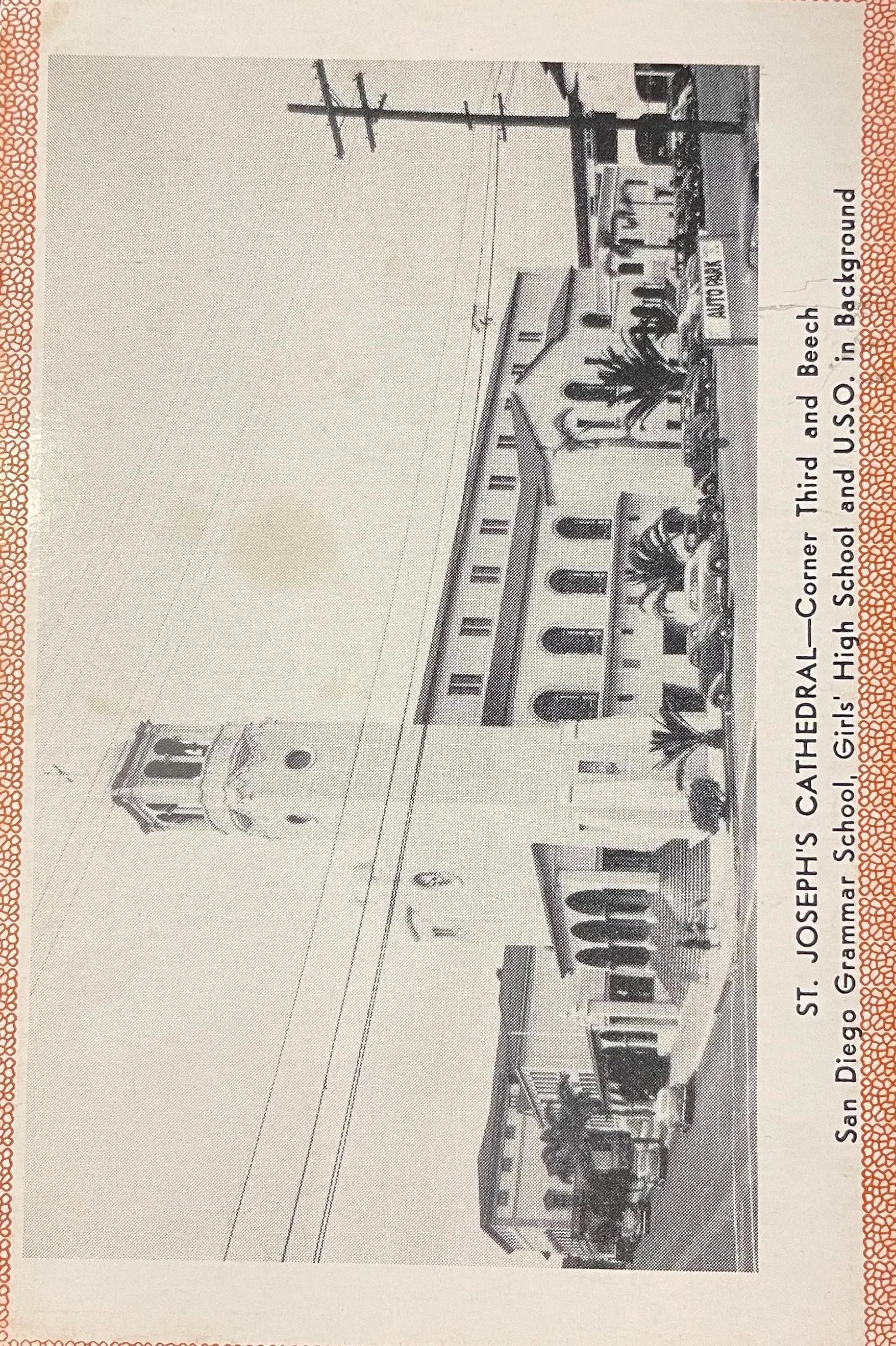 Front: St. Joseph's Cathedral - Corner of Third and Beech San Diego Grammar School, Girls' High School and U. S. O. in Background