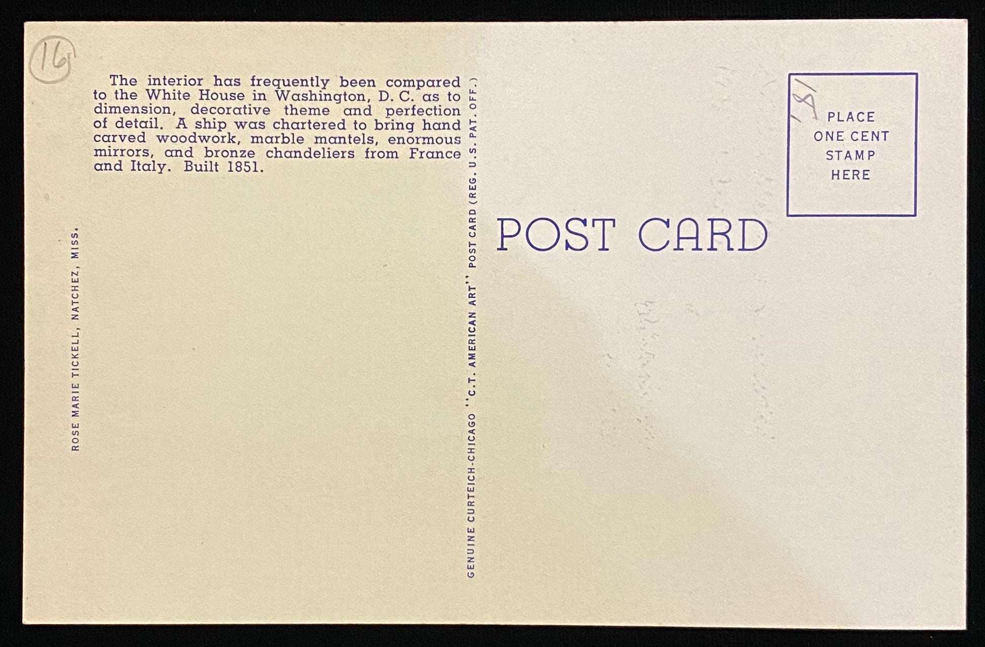 Back: "The interior has frequently been compared to the White House in Washington, D.C. as to dimension, decorative theme and perfection of detail. A ship was chartered to bring hand carved woodwork, marble mantels, enormous mirrors, and bronze chandeliers from France and Italy. Built 1851."