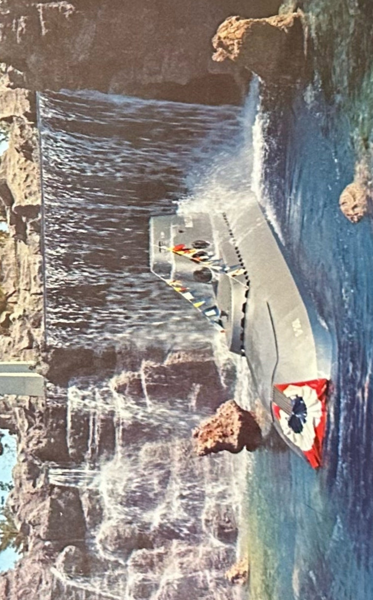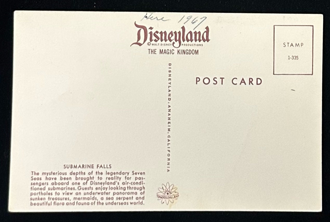 Back Information: Submarine Falls - The mysterious depths of the legendary Seven Seas have been brought to reality for passengers aboard one of Disneyland's air-conditioned submarines. Guests enjoy looking through portholes to view an underwater panorama of sunken treasures, mermaids, a sea serpent and beautiful flora and fauna of the underseas world.