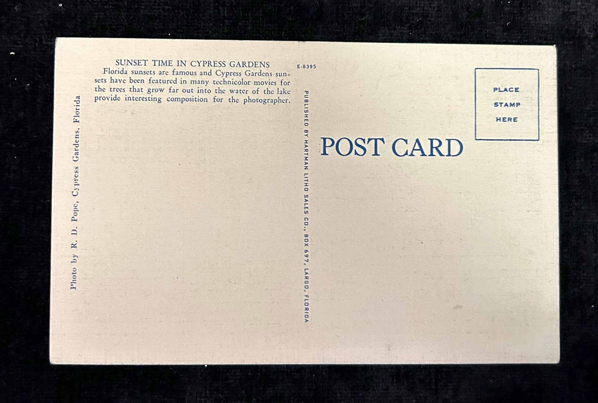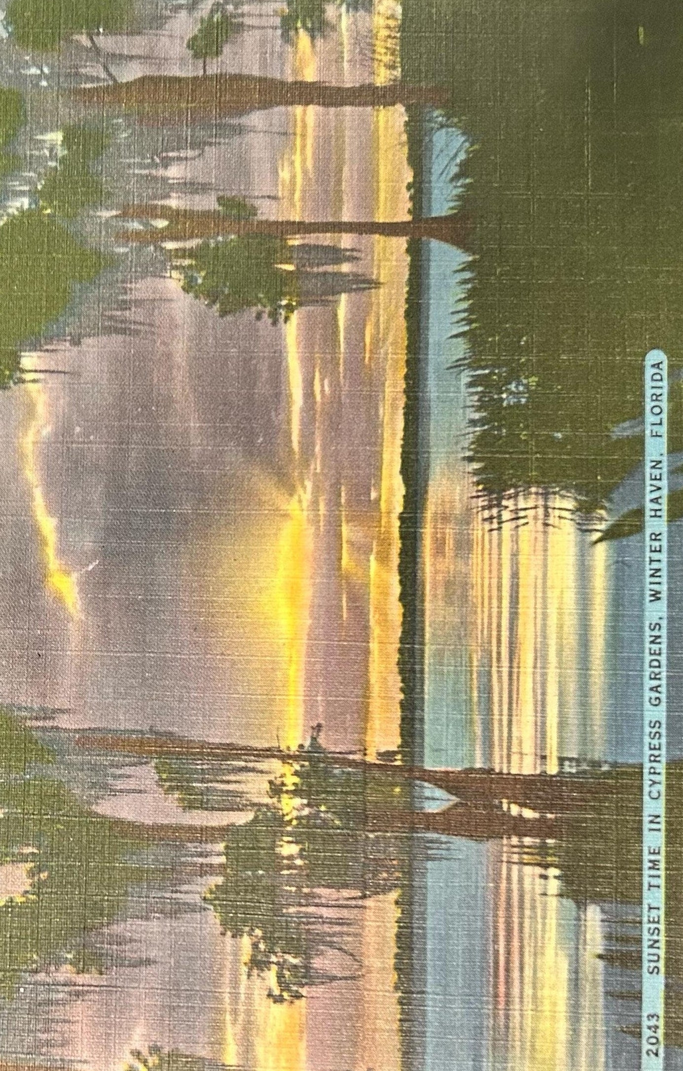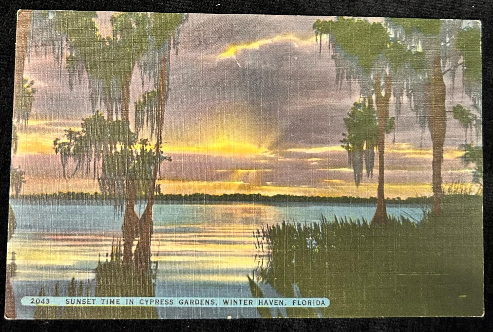 Sunset Time in Cypress Gardens, Winter Haven, Florida - Linen Postcard