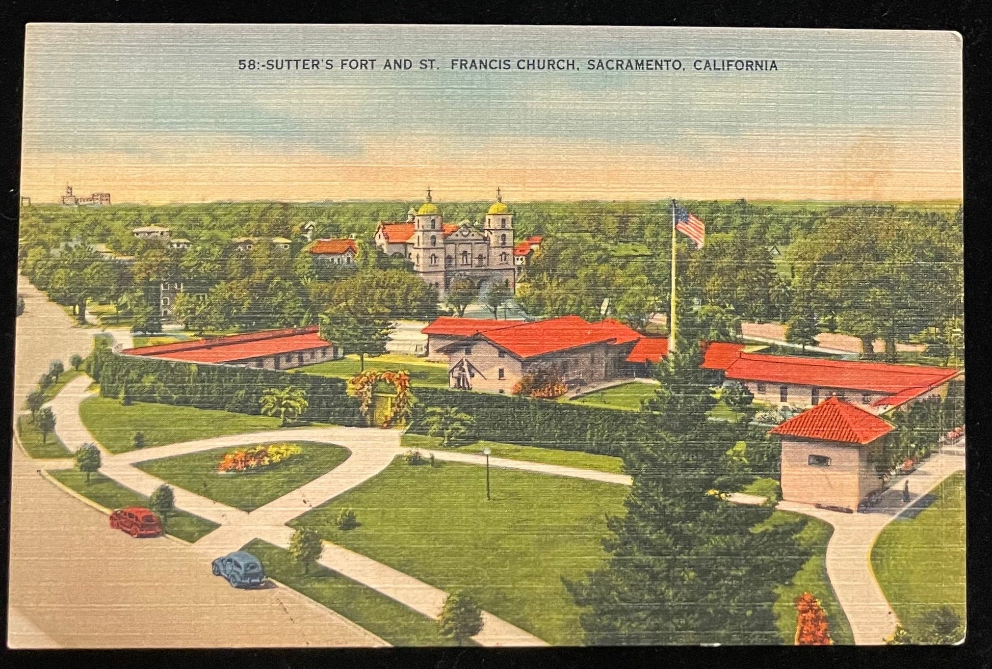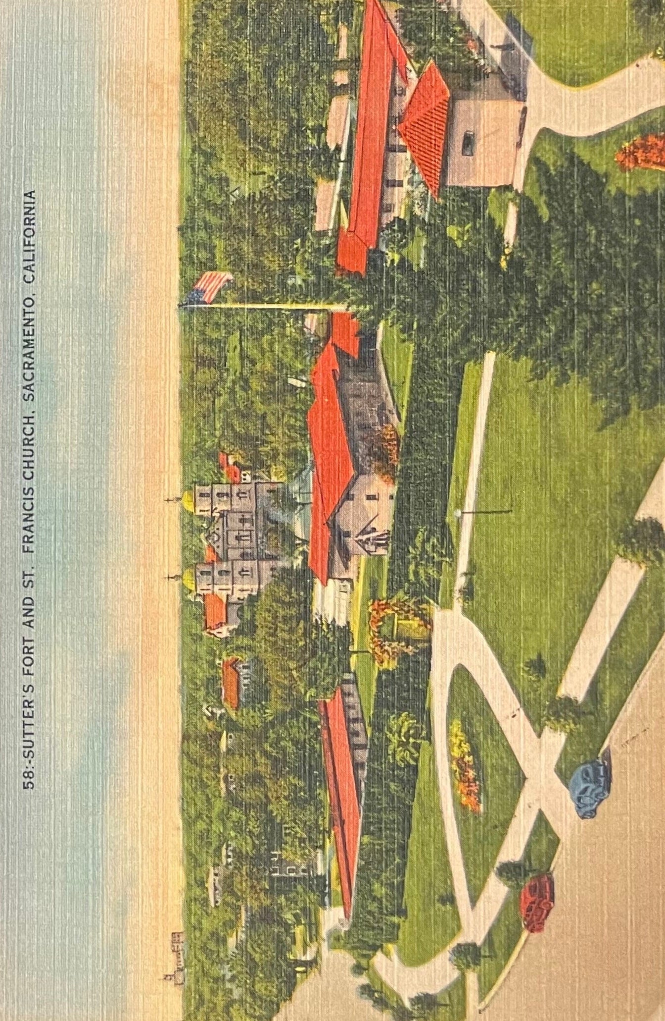 Sutter's Fort and St. Francis Church - Sacramento, California - 1940s Linen Postcard