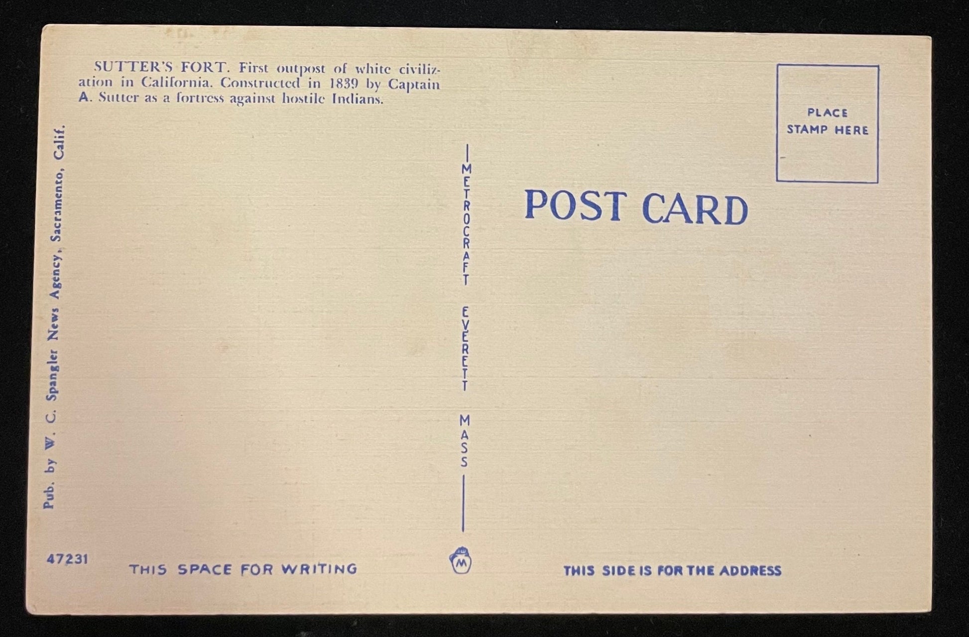 Back information -- "Sutter's Fort. First outpost of white civilization in California. Constructed in 1839 by Captain A. Sutter as a fortress against hostile Indians."