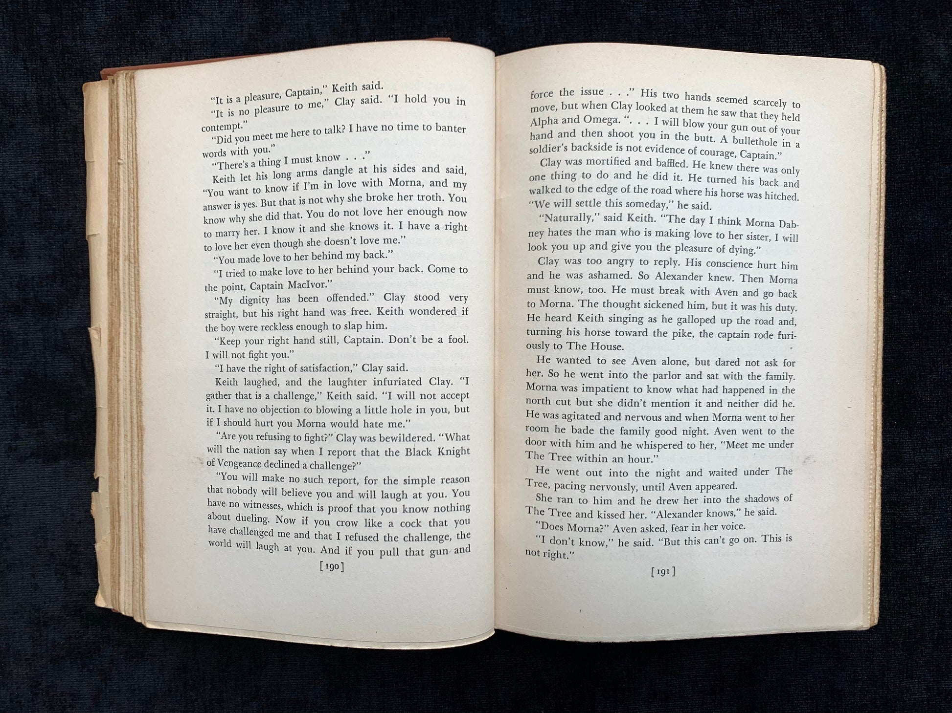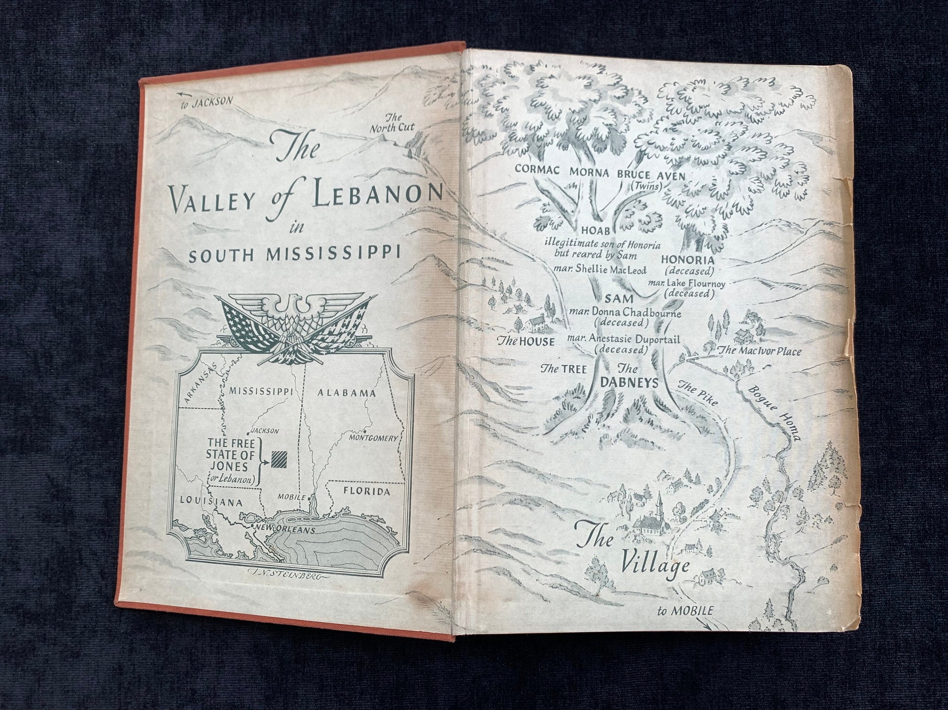 "Tap Roots" by James Street was published in 1942. It is the second book in the "Dabney Family Saga." The series is based on the true story of the Free State of Jones (AKA Lebanon) in Missouri, and the armed revolt against the Confederacy led by Newton Knight and takes place during the Civil War. The endpapers feature a map of the area as well as an illustration of the Dabney family tree.