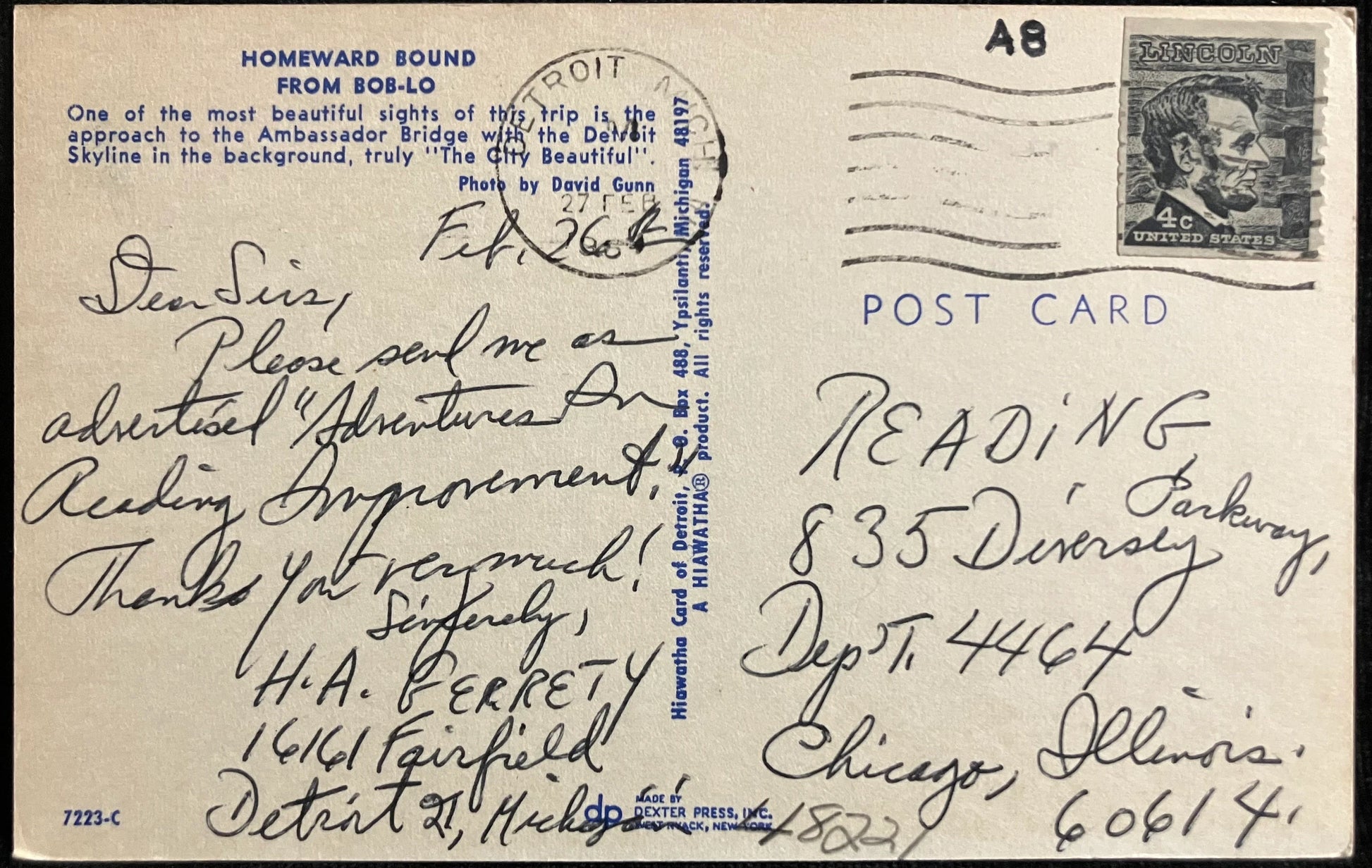 Mailed: Postmark on February 27, from the 1960s with a grey four cent Abraham Lincoln stamp