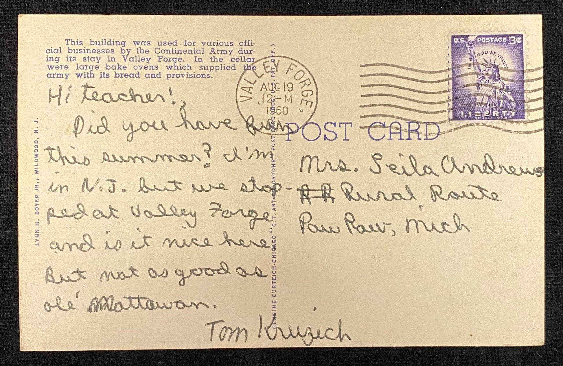 Condition: The postcard is in good condition with worn corners. There is writing on the back.