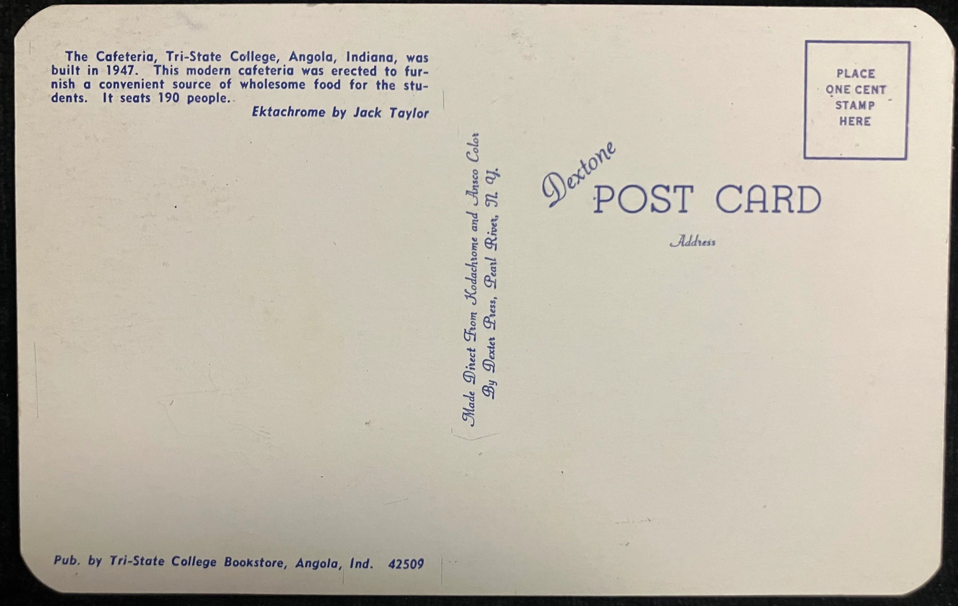 On front: A photo of the Cafeteria at Tri-State College in Angola, Indiana