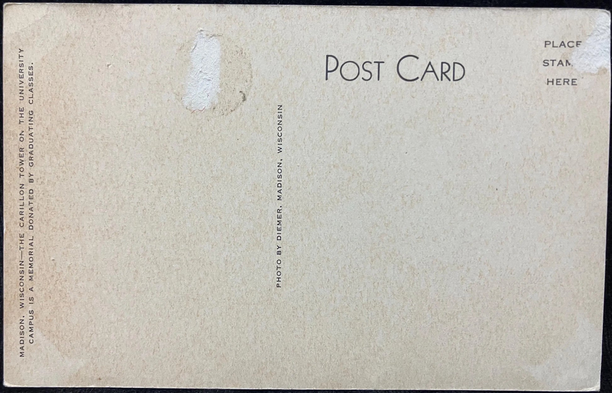 The Carillon Tower on the University Campus - Madison, Wisconsin - Photo: Diemer - Vintage Campus Postcard