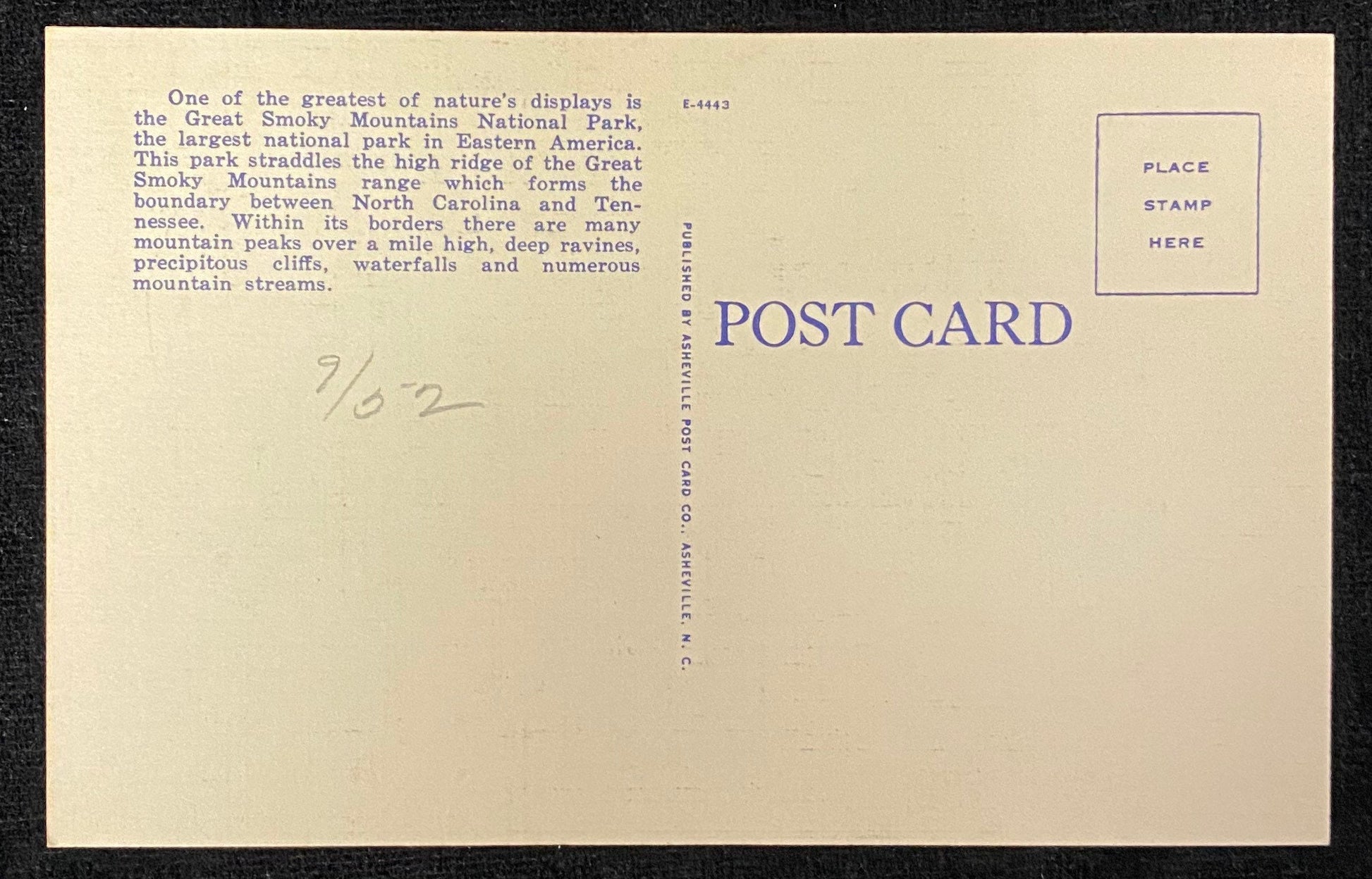 Back: "One of the greatest of nature's displays is the Great Smoky Mountains National Park, the largest national park in Eastern America. This park straddles the high ridge of the Great Smoky Mountains range which forms the boundary between North Carolina and Tennessee. Within its borders there are many mountain peaks over a mile high, deep ravines, precipitous cliffs, waterfalls and numerous mountain streams."