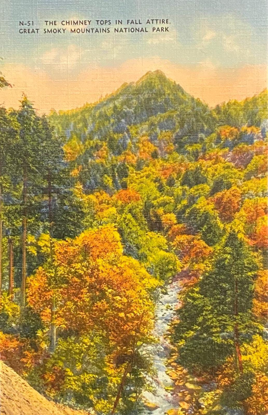The Chimney Tops in Fall Attire - Great Smoky Mountains National Park, Tennessee - 1940s Linen Postcard