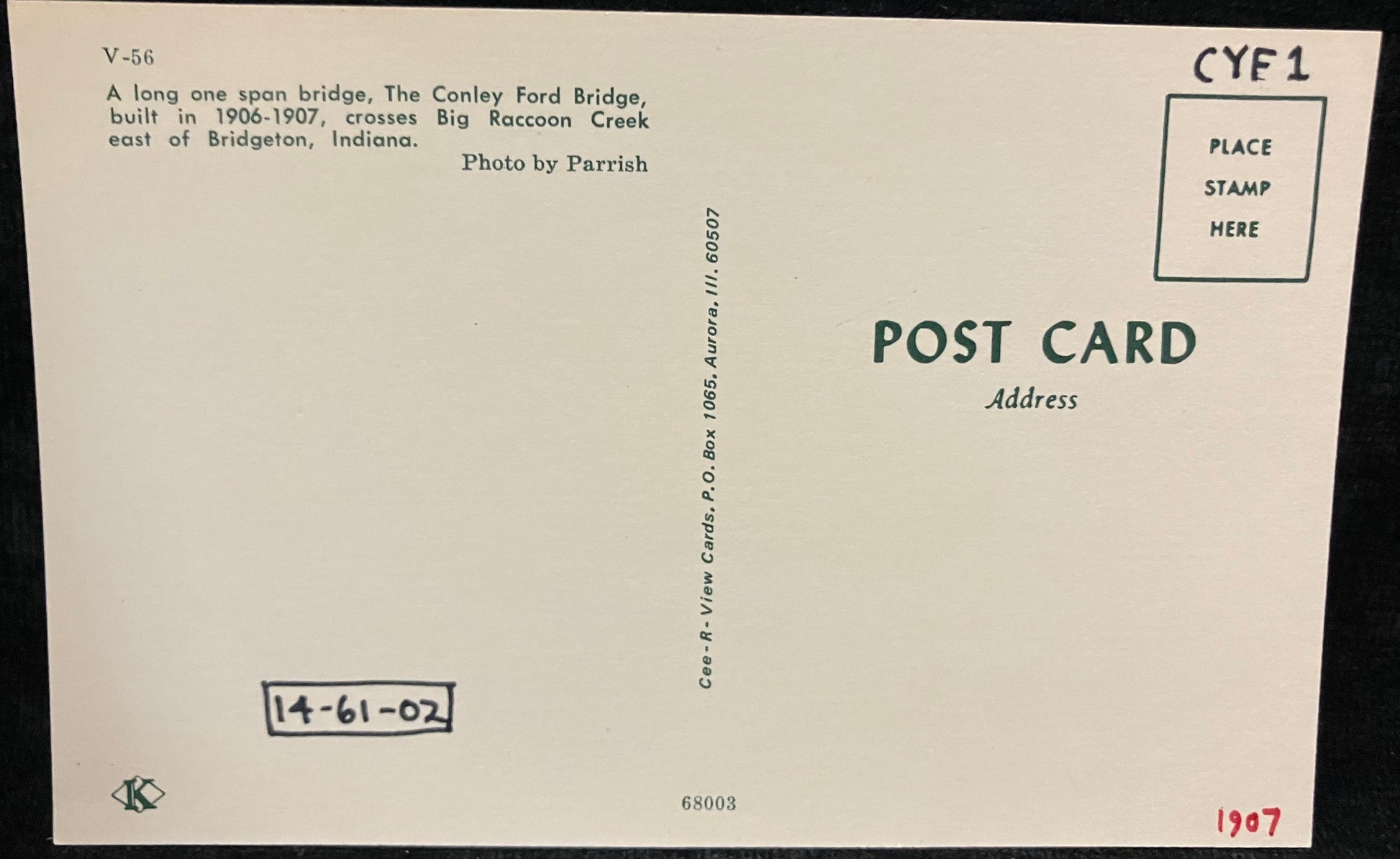 The Conley’s Ford Bridge - Bridgeton, Indiana - Photo: Parrish - Vintage Covered Bridge Postcard
