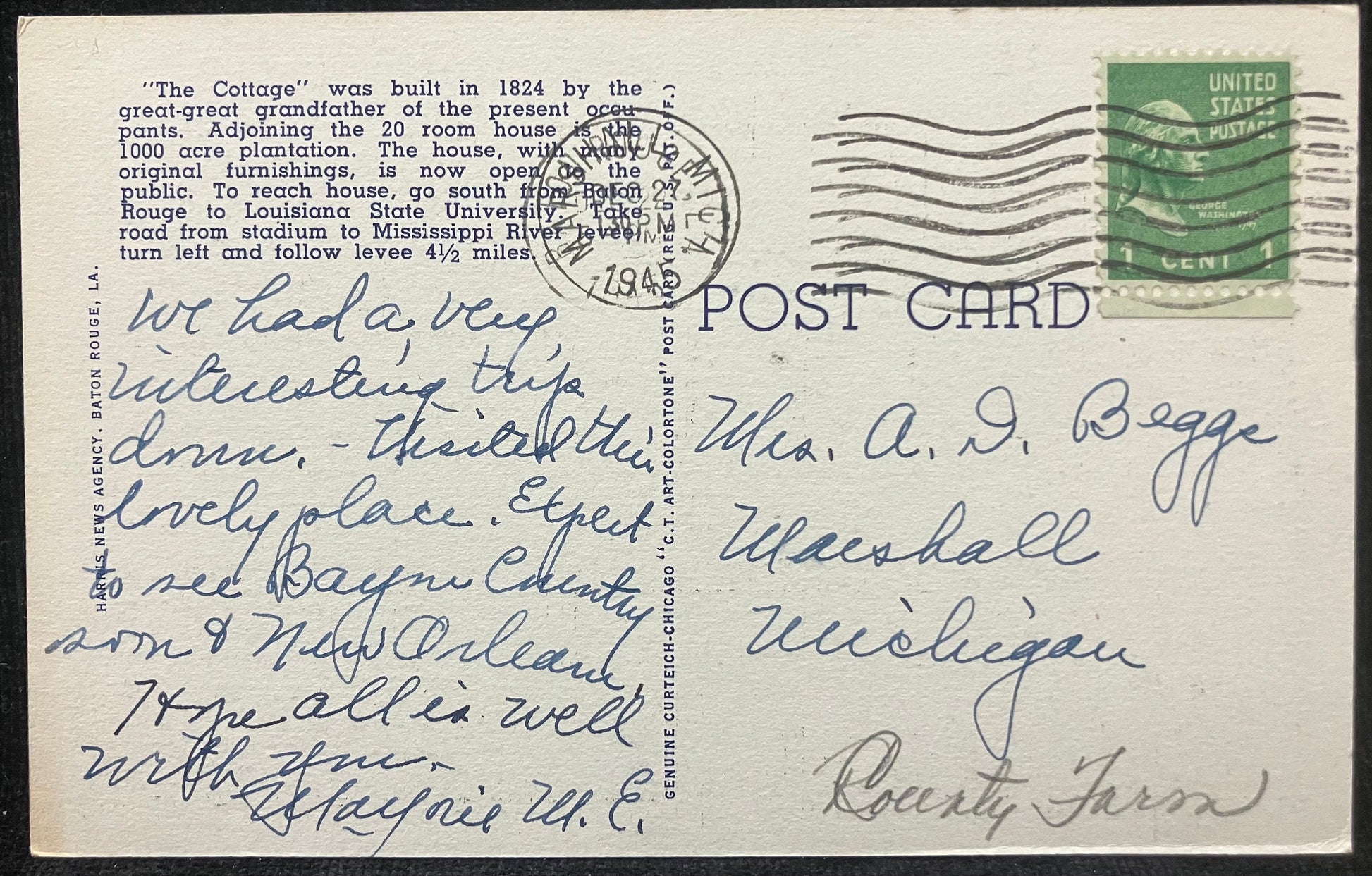 Back: “The Cottage” was built in 1824 by the great-great grandfather of the present occupants. Adjoining the 20 room house is the 1000 acre plantation. The house, with many original furnishings, is now open to the original furnishings, is now open to the public. To reach house, go south from Baton Rouge to Louisiana State University. Take road from stadium to Mississippi River levee, turn left and folllow levee 4 1/2 miles.