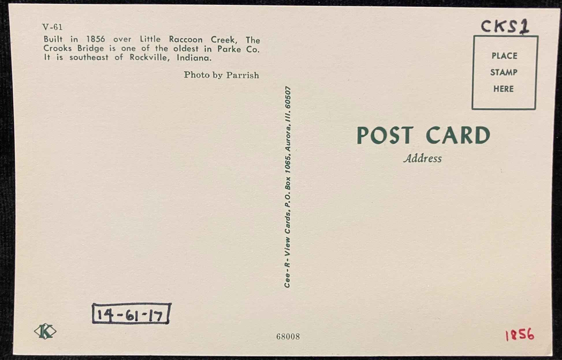 The Crooks Bridge near Rockville, Indiana - Photo: Parrish - Vintage Covered Bridge Postcard