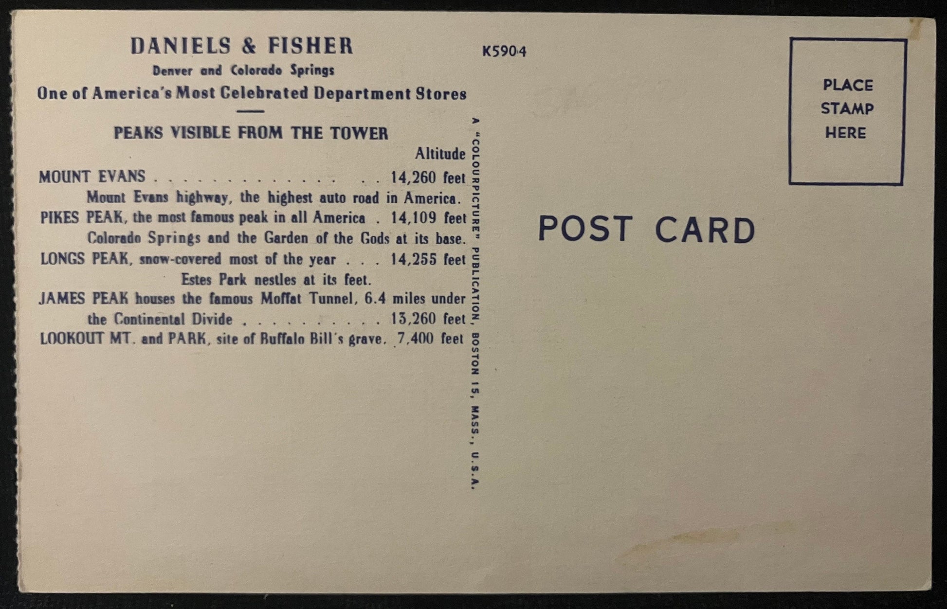 On back: Daniels & Fisher Denver and Colorado Springs. One of America's Most Celebrated Department Stores. Peaks Visible from the Tower. MOUNT EVANS ......... Altitude 14,260 feet Mount Evans highway, the highest auto road in America. PIKES PEAK, the most famous peak in all America . 14,109 feet Colorado Springs and the Garden of the Gods at its base. LONGS PEAK, snow-covered most of the year ... 14,255 feet Estes Park nestles at its feet. JAMES PEAK houses the famous Moffat Tunnel, 6.4 miles under the Continental Divide......... 13,260 feet LOOKOUT M. and PARK, site Buffalo Bill's grave, 7,400 feet