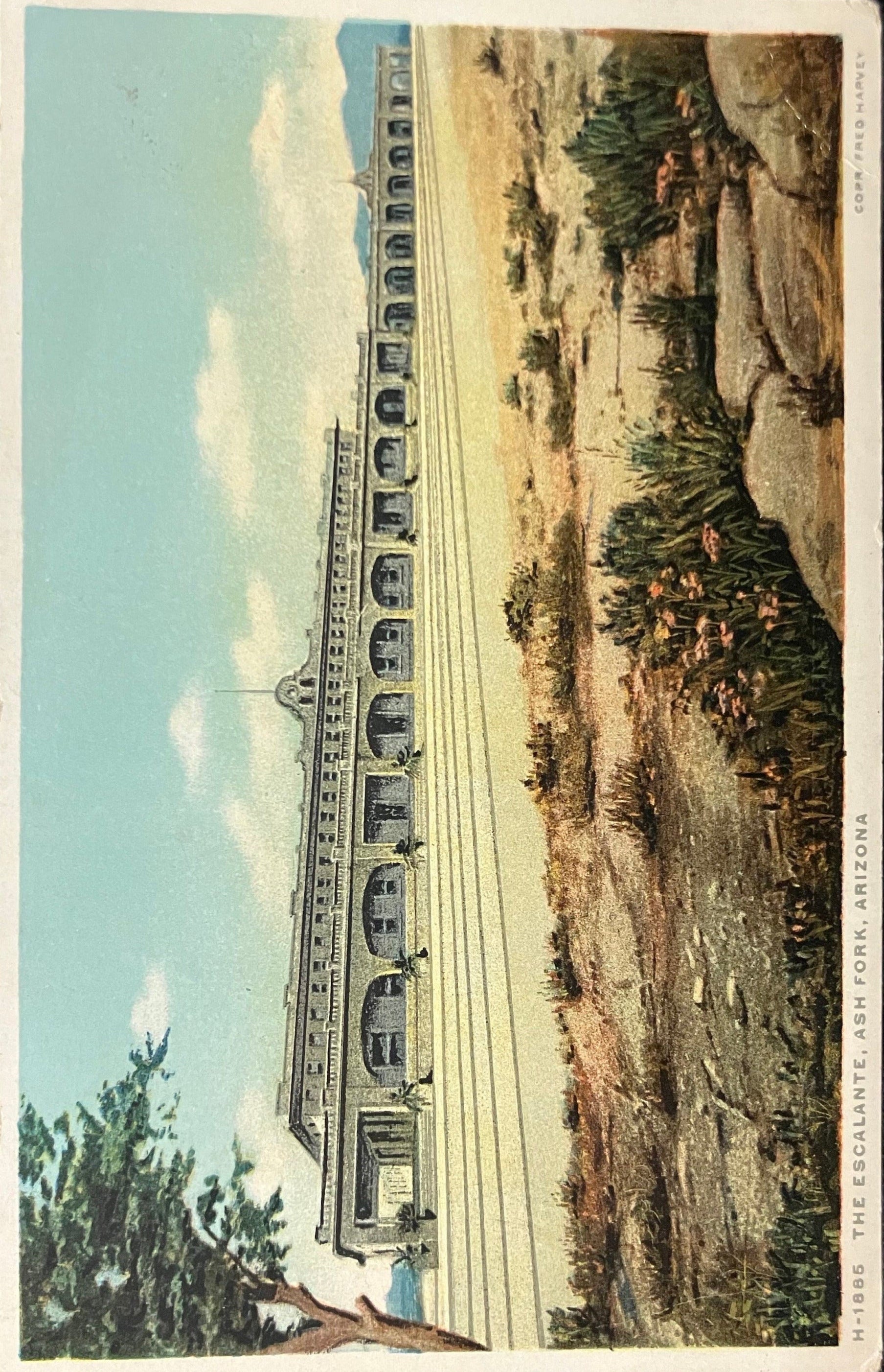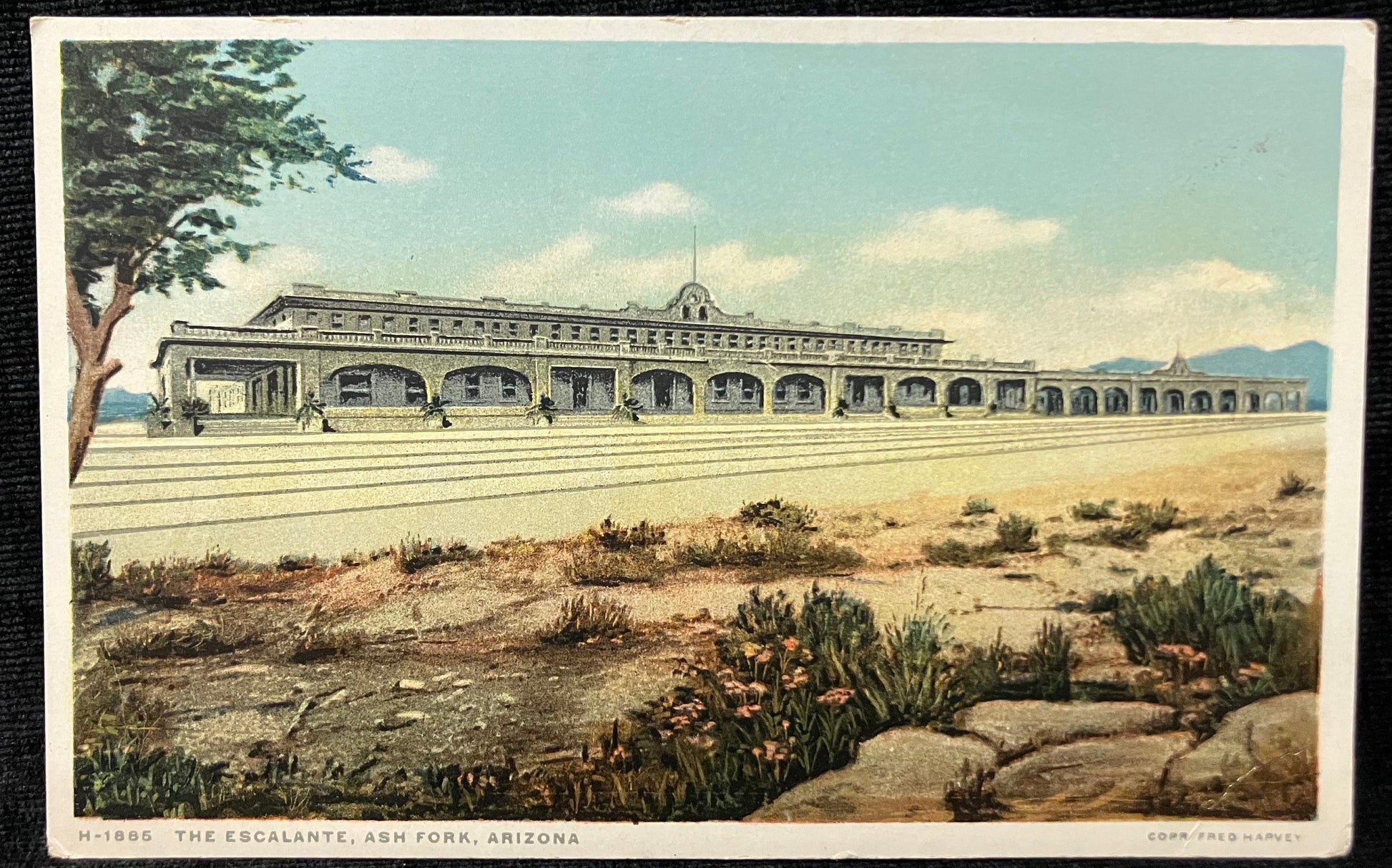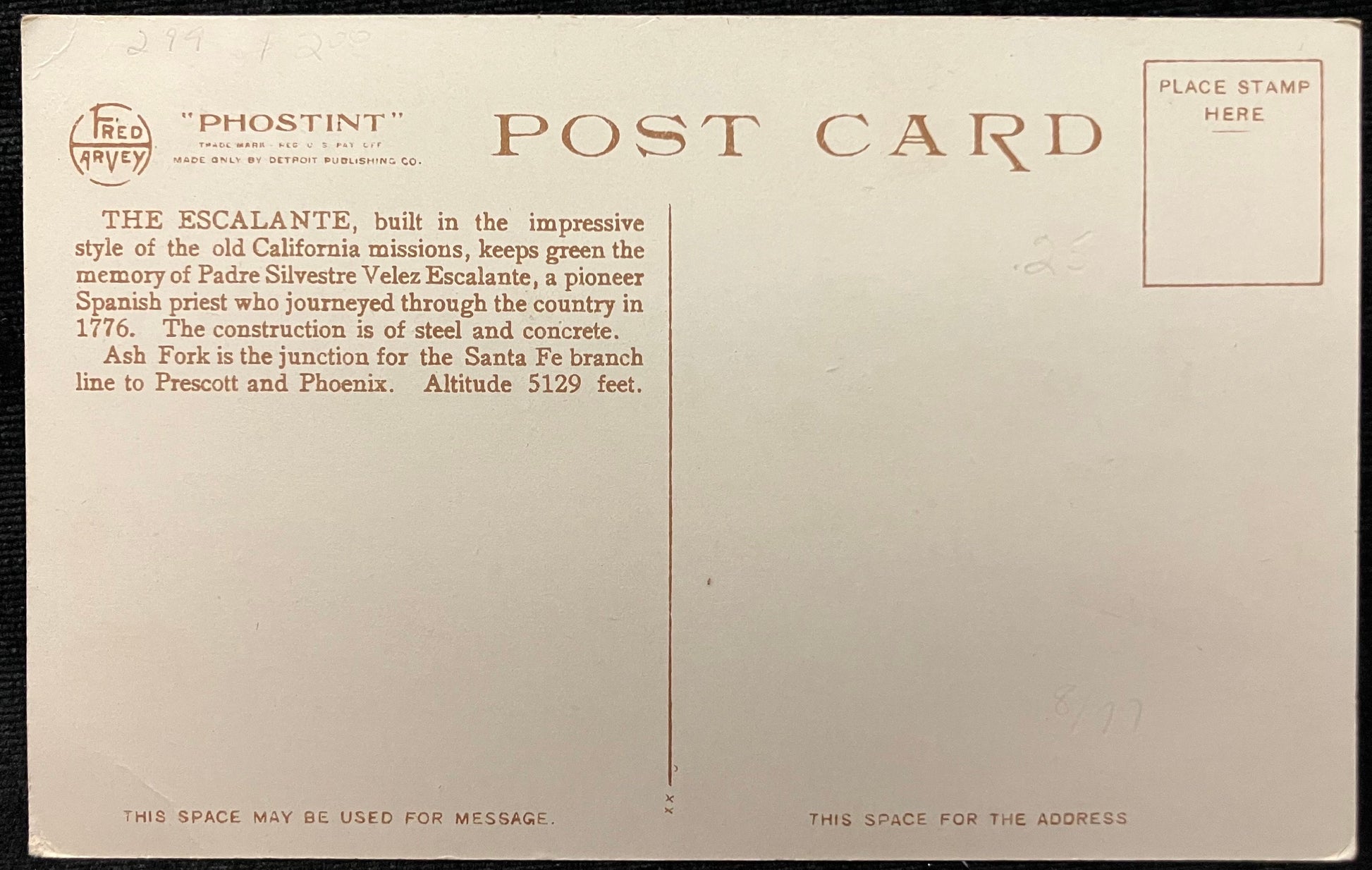 On back: The Escalante, built in the impressive style of the old California missions, keeps green the memory of Padre Silvestre Velez Escalante, a pioneer Spanish priest who journeyed through the country in Spanish priest who journeyed through the country in 1776. The construction i is of steel and concrete. Ash Fork is the junction for the Santa Fe branch line to Prescott and Phoenix. Altitdue 5129 feet.