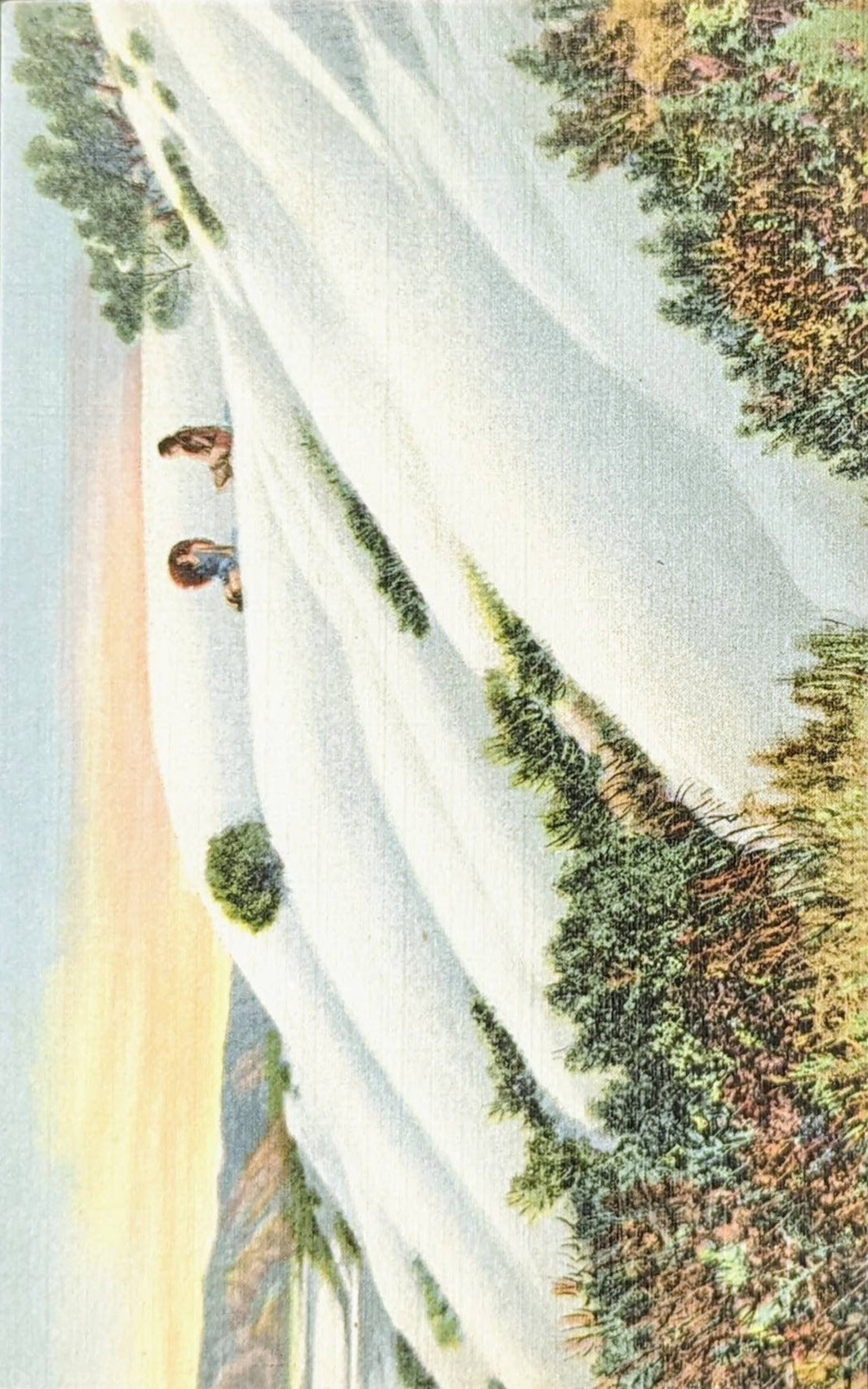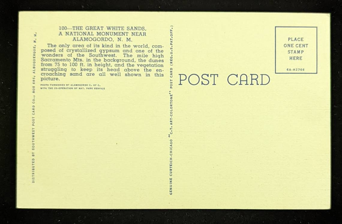 Back Information: The only area of its kind in the world, composed of crystallized gypsum and one of the wonders of the Southwest. The mile high Sacramento Mountains in the background, the dunes from 75 to 100 ft. in height, and the vegetation struggling to keep its head above the encroaching sand are all well shown in this picture.