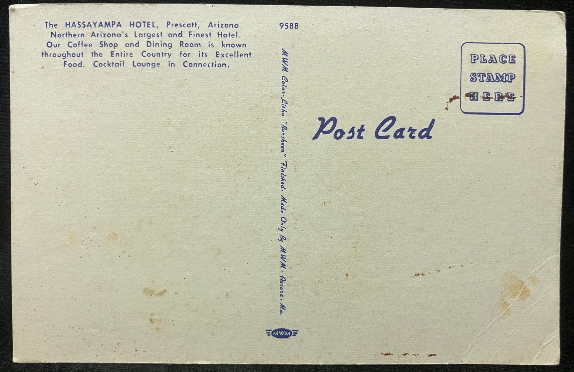 On back: The Hassayampa Hotel, Prescott, Arizona. Northern Arizona’s Largest and Finest Hotel. Our Coffee Shop and Dining Room is known throughout the Entire Country for its Excellent Food. Cocktail Lounge in Connection.