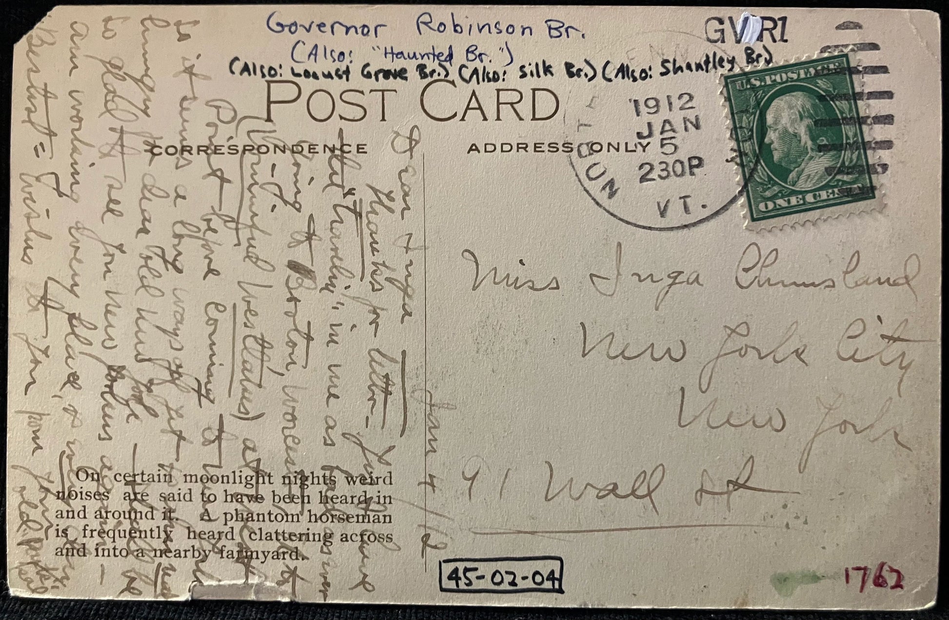 Mailed: Postmark: 1912 from Vermont with a green one cent Benjamin Franklin stamp