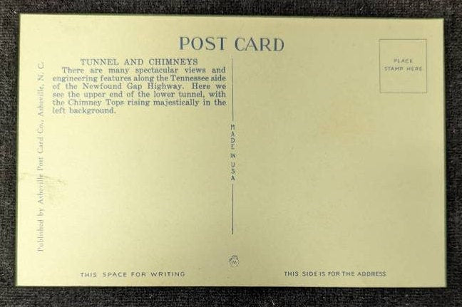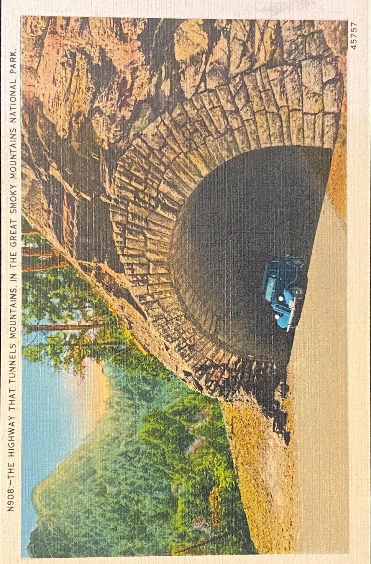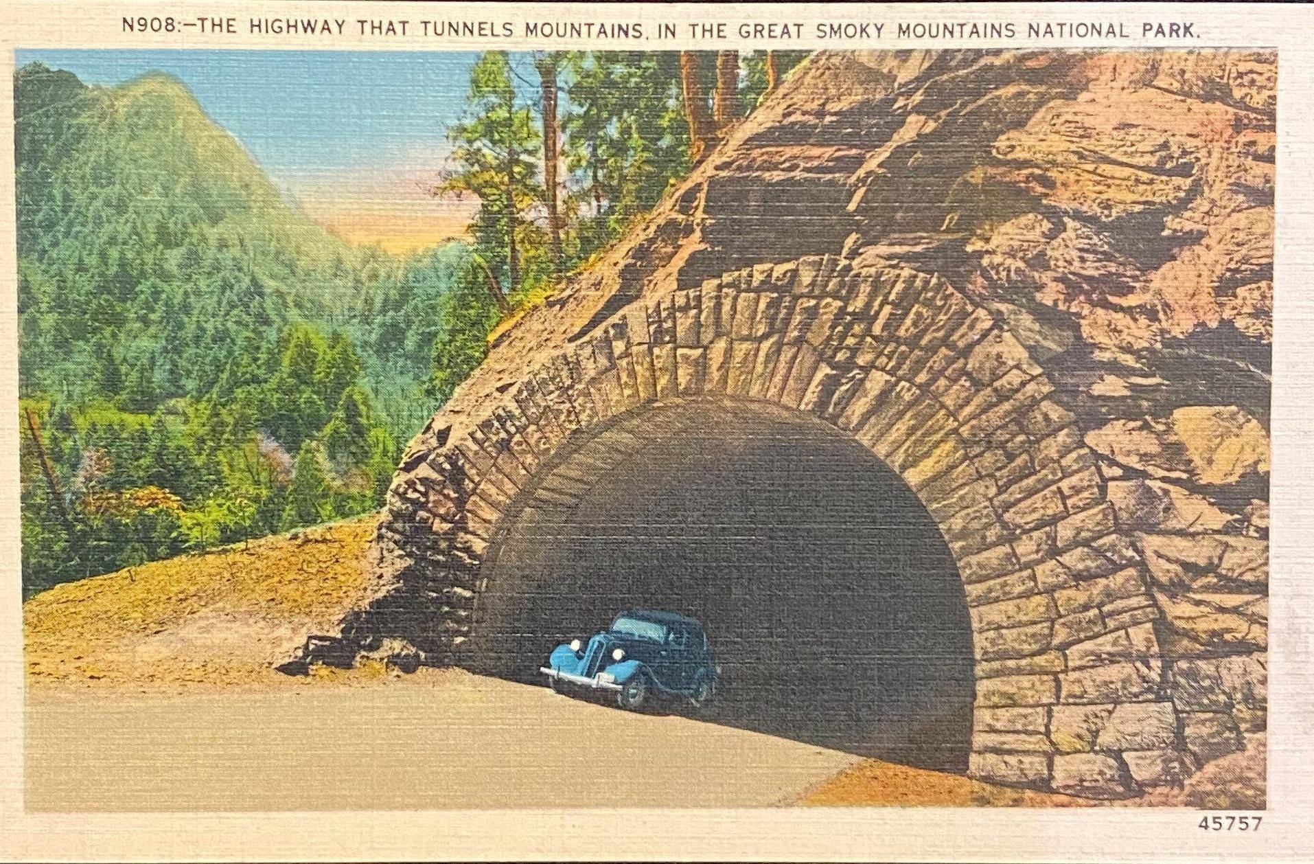 The Highway That Tunnels Mountains - The Great Smokey Mountains National Park, Tennessee - 1940s Linen Postcard