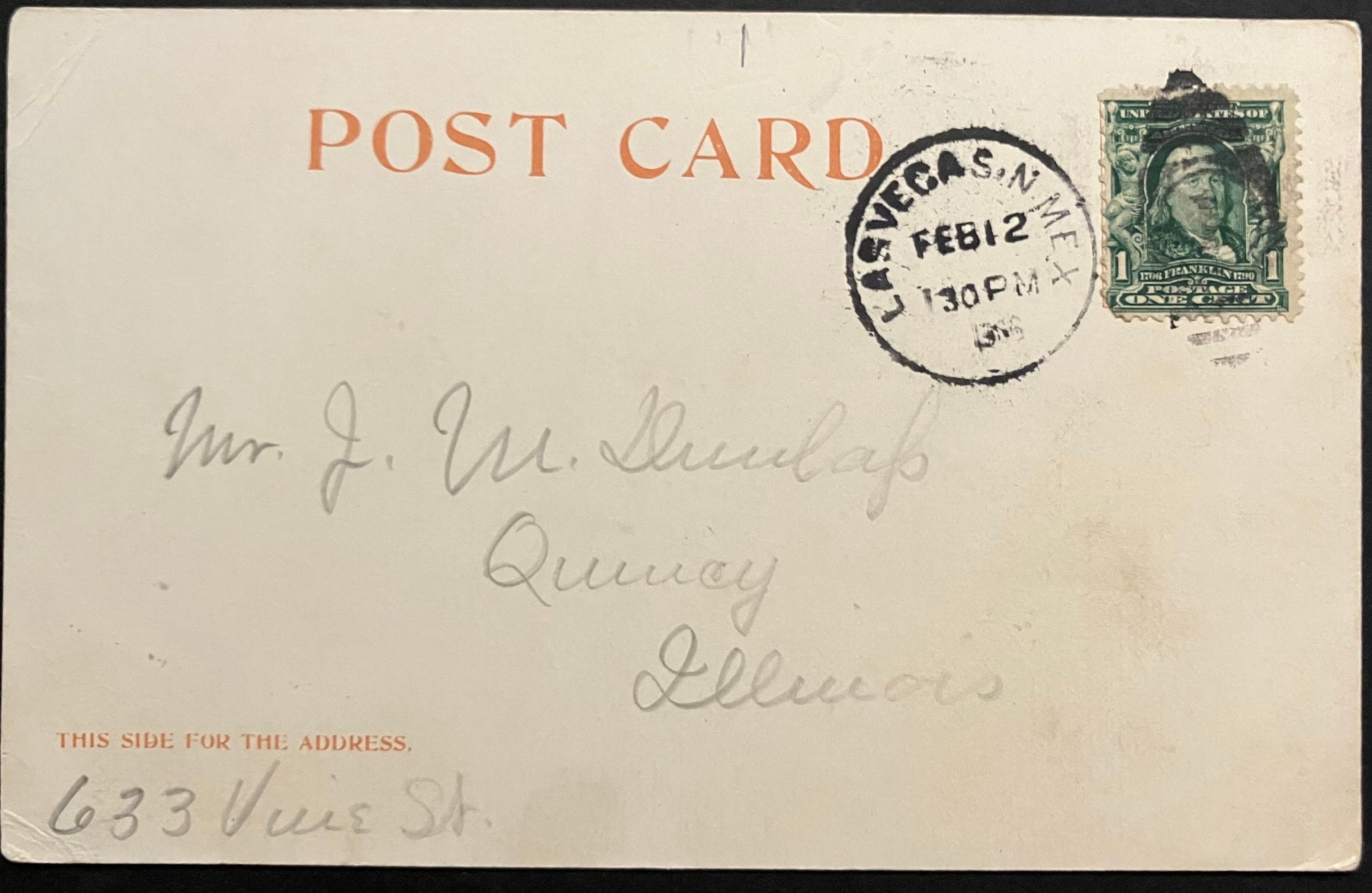 Mailed: Postmark on February 12, 1906 from Las Vegas, New Mexico with a green one cent Benjamin Franklin stamp