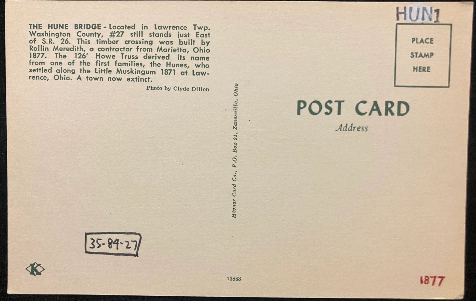 Back: THE HUNE BRIDGE - Located in Lawrence Twp. Washington County, #27 still stands just East of S.R. 26. This timber crossing was built by Rollin Meredith, a contractor from Marietta, Ohio 1877. The 126’ Howe Truss derived its name from one of the first families, the Hines, who settled along the Little Muskingum 1871 at Lawrence, Ohio. A town now extinct.