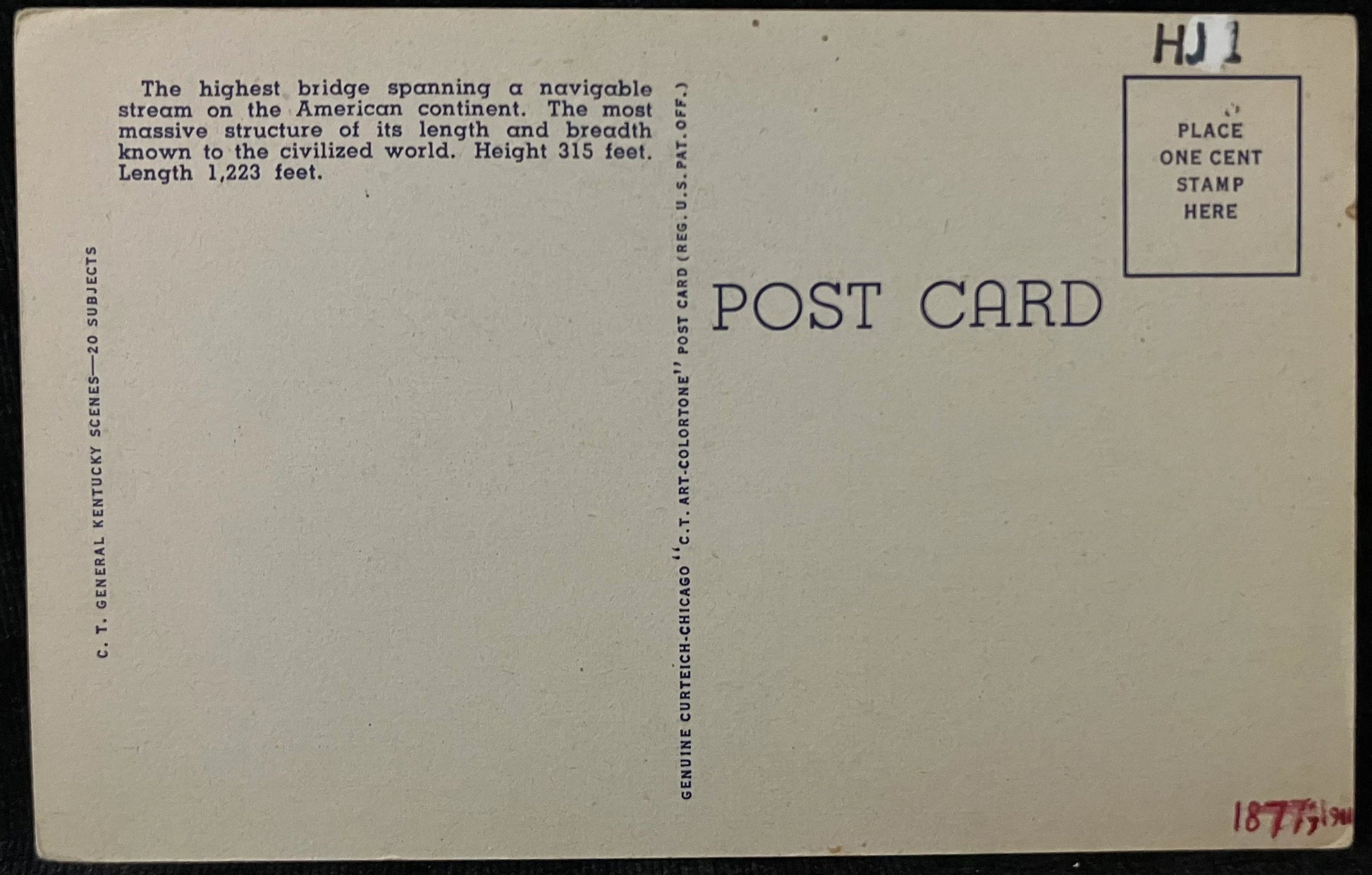 On back: The highest bridge spanning a navigable stream on the American continent. The most massive structure of its length and breadth known to the civilized world. Height 315 feet. Length 1,223 feet.