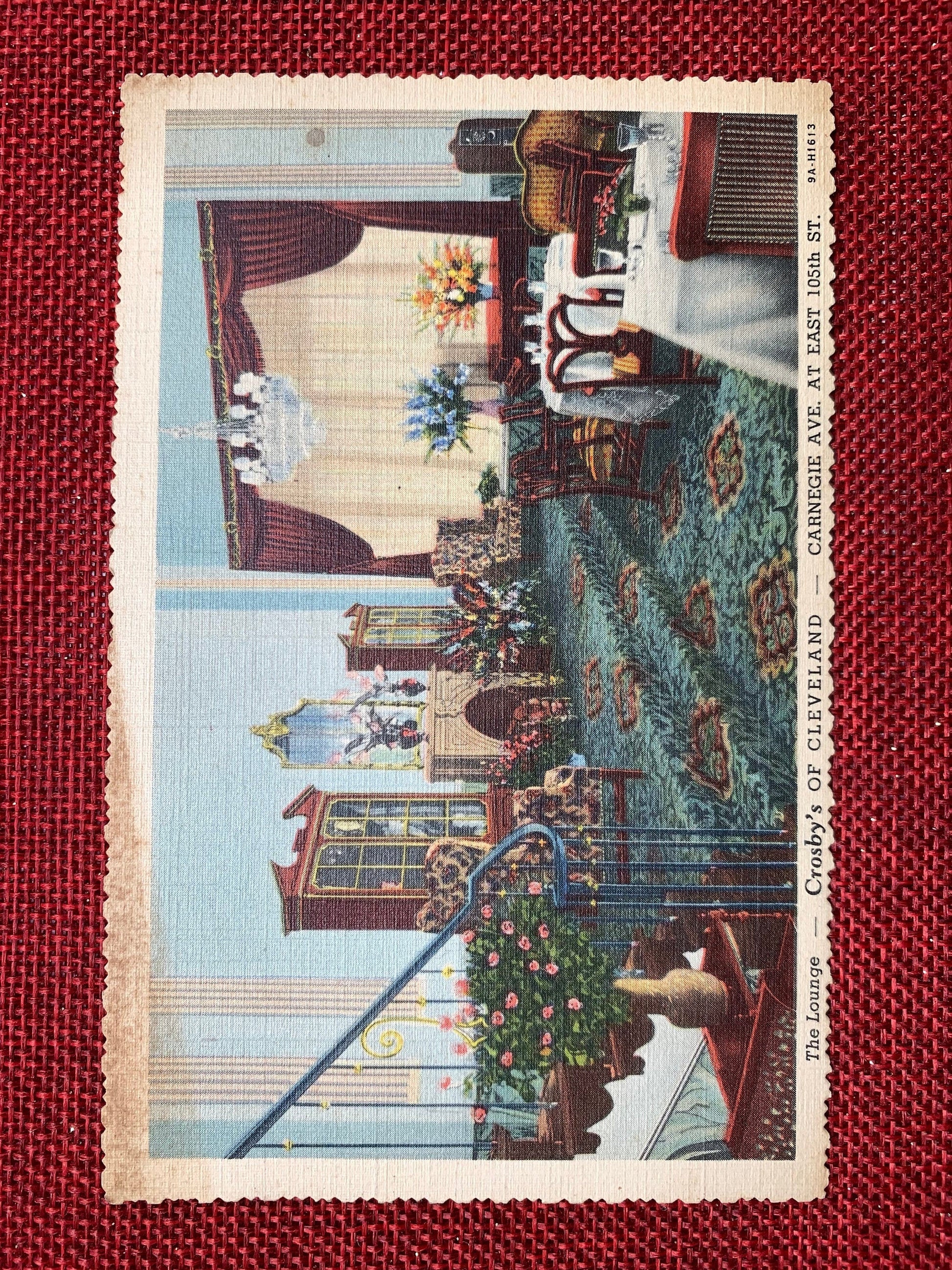 This postcard features a hand tinted image of The Lounge in Crosby's of Cleveland.