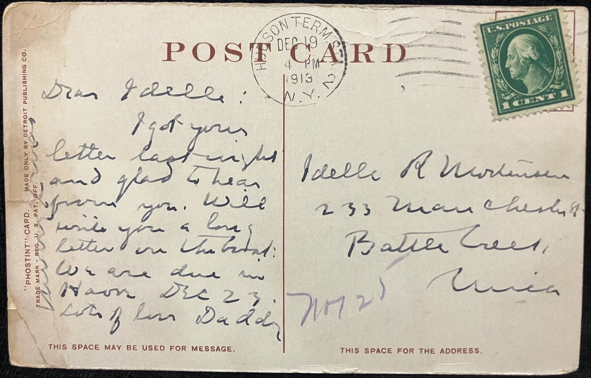 Mailed: Postmark 1913 green one cent George Washington stamp