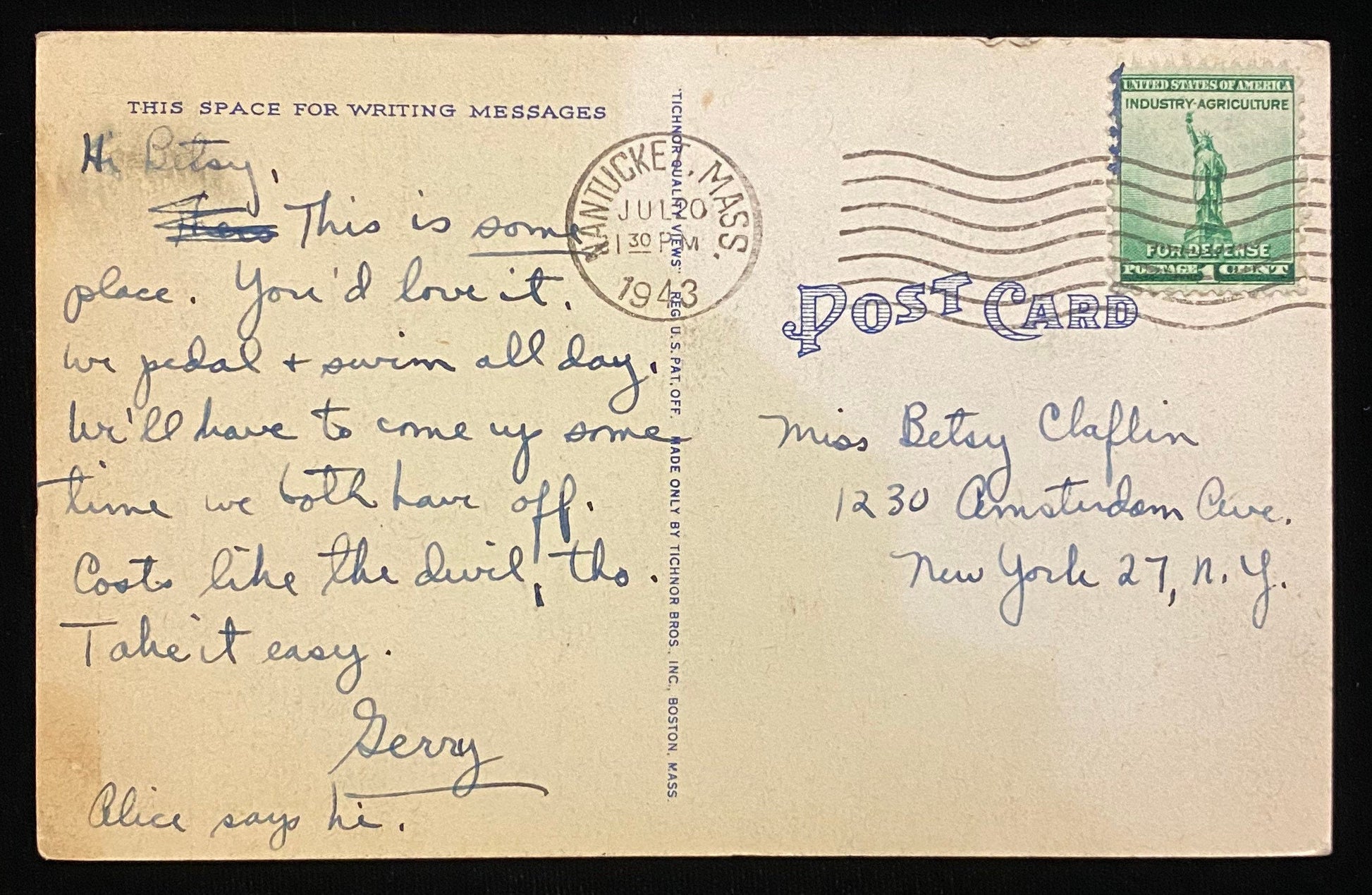 Condition: Fair condition. The edges are worn and there is writing on the back because the card has been mailed.