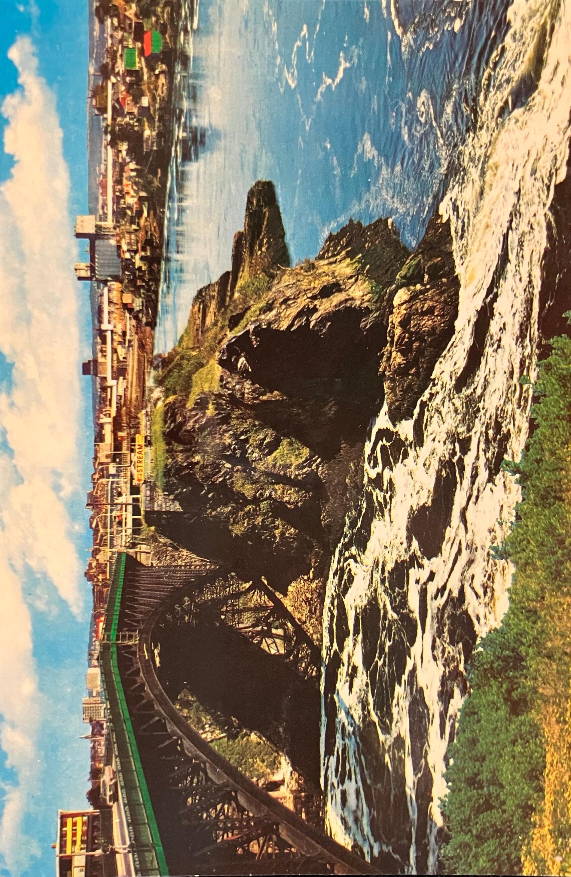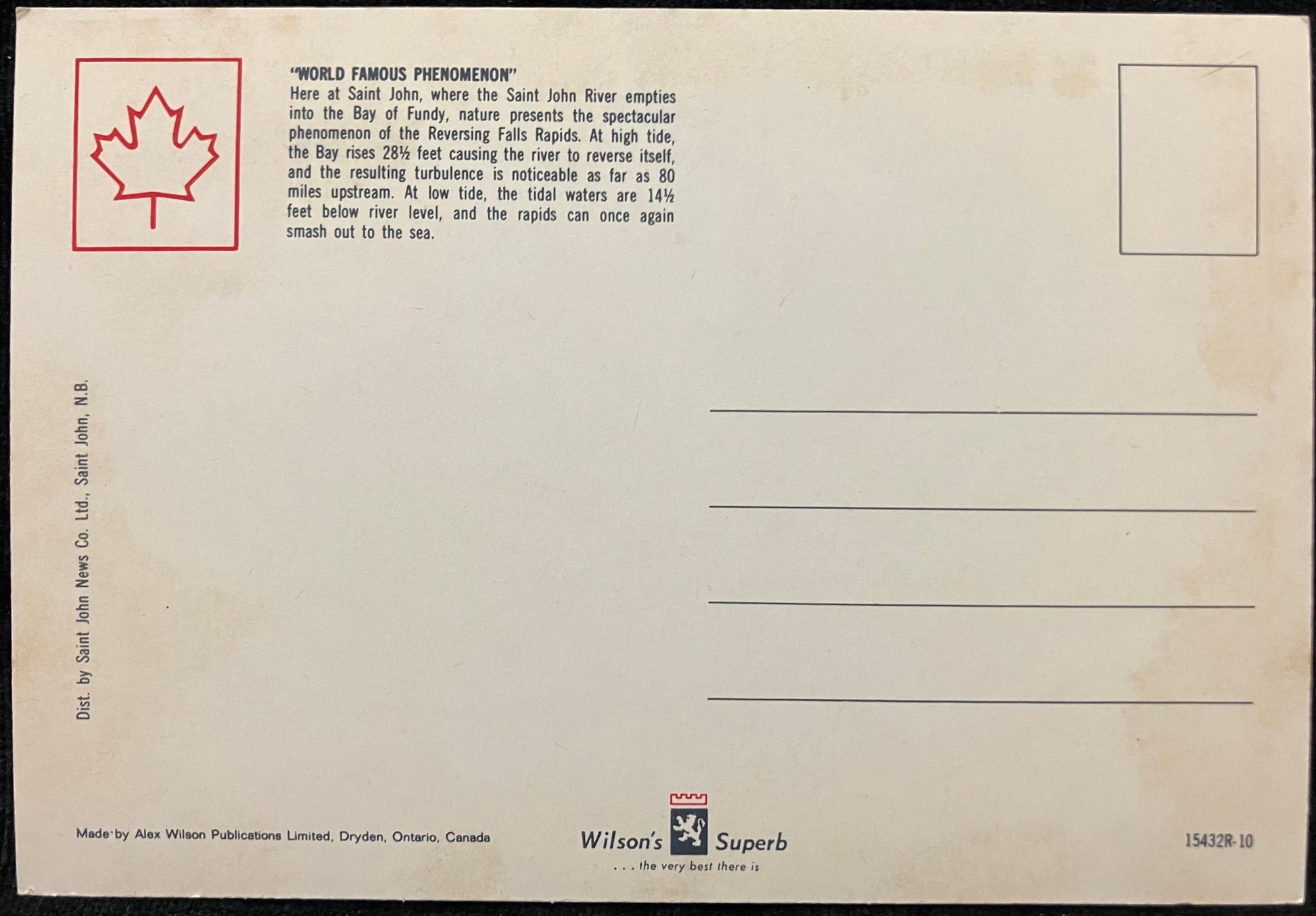 On back: “WORLD FAMOUS PHENOMENON” Here at Saint John, where the Saint John River empties into the Bay of Fundy, nature presents the spectacular phenomenon of the Reversing Falls Rapids. At high tide, the Bay rises 28 1/2 feet causing the river to reverse itself, and the resulting turbulence is noticeable as far as 80 miles upstream. At low tide, the tidal waters are 14 1/2 feet below river level, and the rapids can once again smash out to the sea.