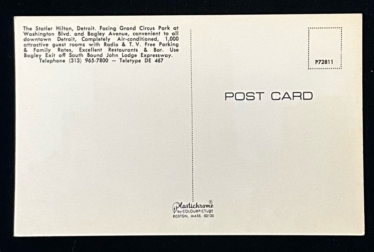 Back Information: The Statler Hilton, Detroit. Facing Grand Circus Park at Washington Blvd. and Bagley Avenue, convenient to all downtown Detroit, Completely Air-Conditioned, 1,000 attractive guest rooms with Radio & T.V. Free Parking & Family Rates. Excellent Restaurants & Bar. Use the Bagley Exit off the Bound John Lodge Expressway. Telephone (313) 965-7800 - Teletype DE 467