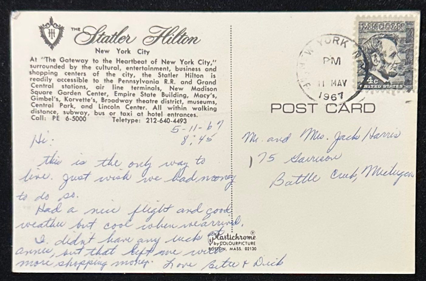 Mailed: Posted on May 11, 1967 from New York, New York with a 4 cent Lincoln stamp