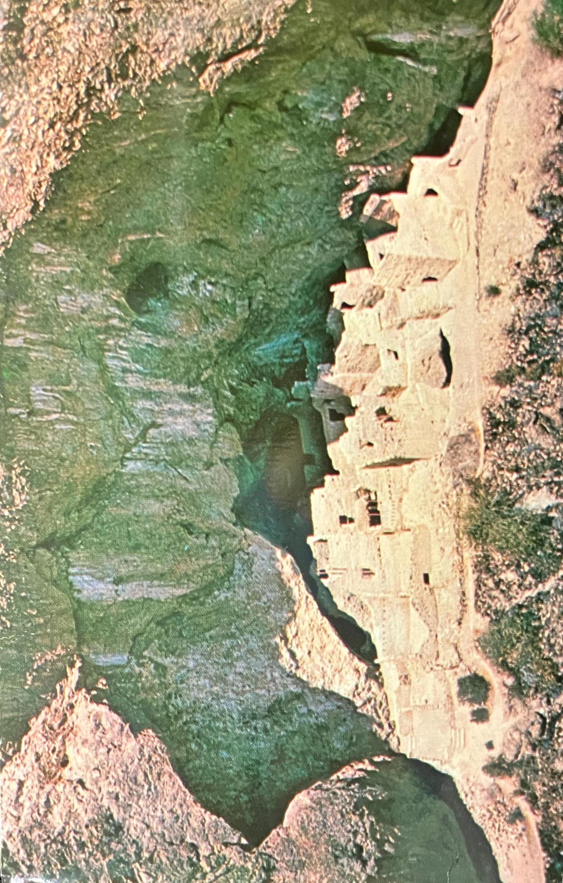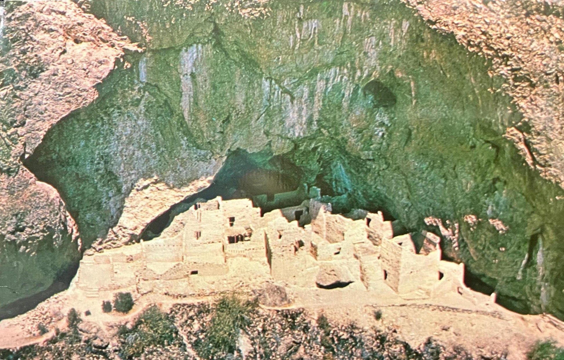 Back: THE UPPER RUIN, TONTO NATIONAL MONUMENT ROOSEVELT, ARIZONA Built in a natural cave by Salado Indian Farmers of the 14th century A. D., this village contained 40 rooms - some two stories high - with walls of mud and stone, and roofs of poles and brush.