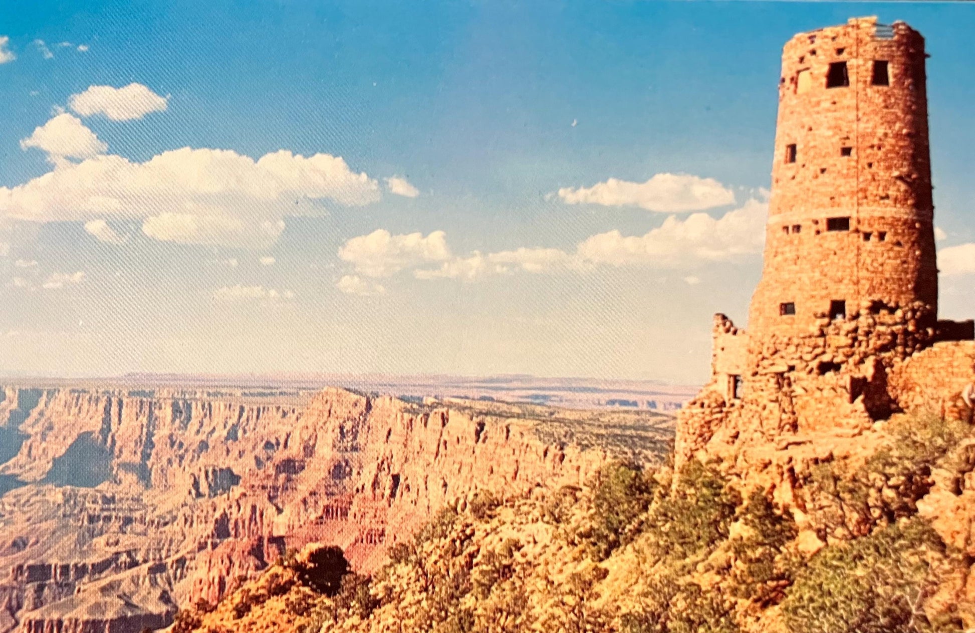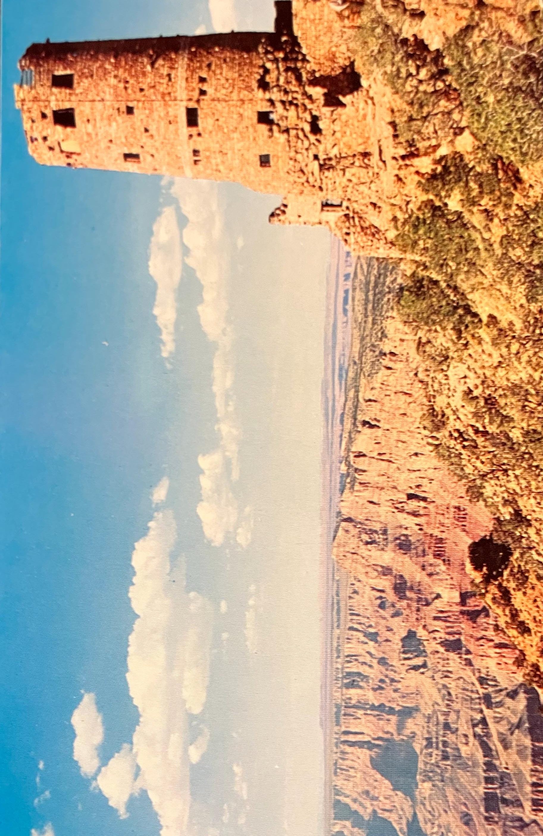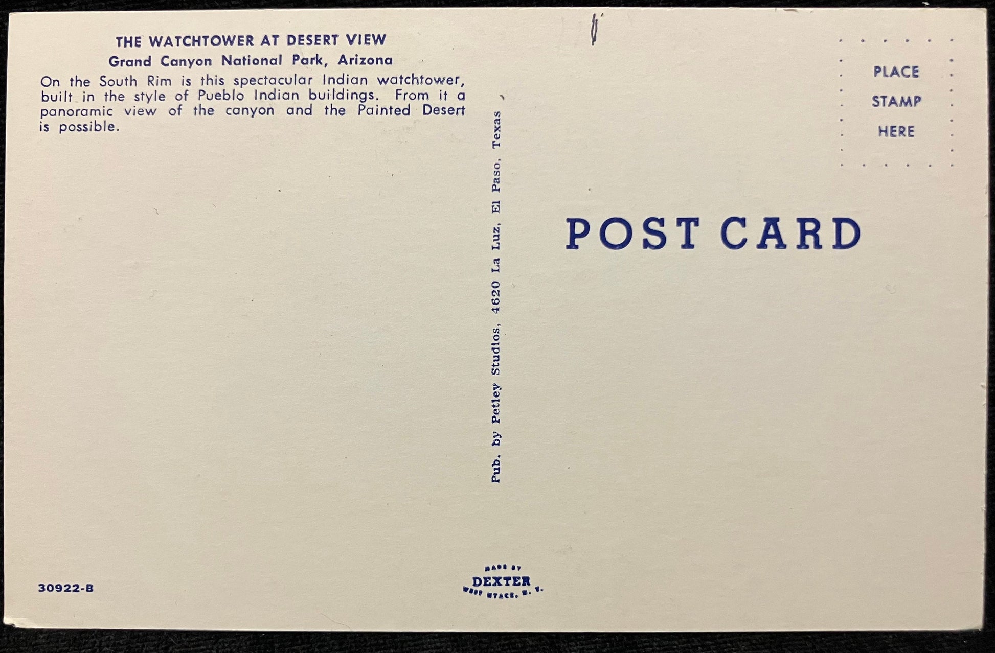 On front: A photo of The Watchtower at Desert View in Grand Canyon National Park, Arizona