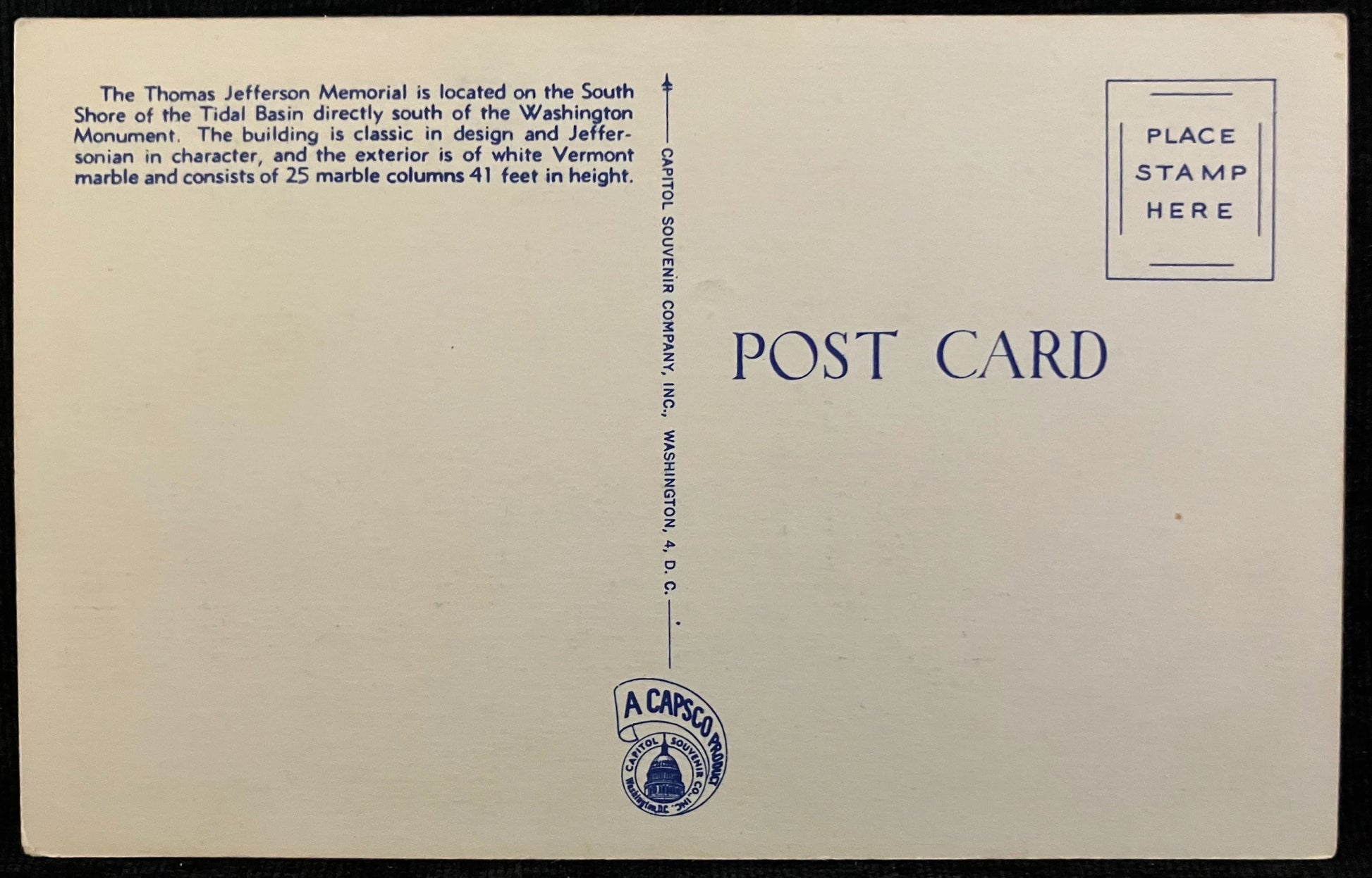 Back: The Thomas Jefferson Memorial is located Ont he South Shore of the Tidal Basin directly south of the Washington Monument. The building is classic design and Jeffersonian in character, and the exterior is the white Vermont marble consists of 25 marble columns 41 feet in height.