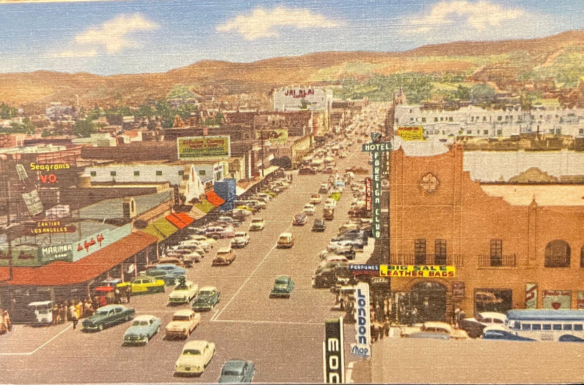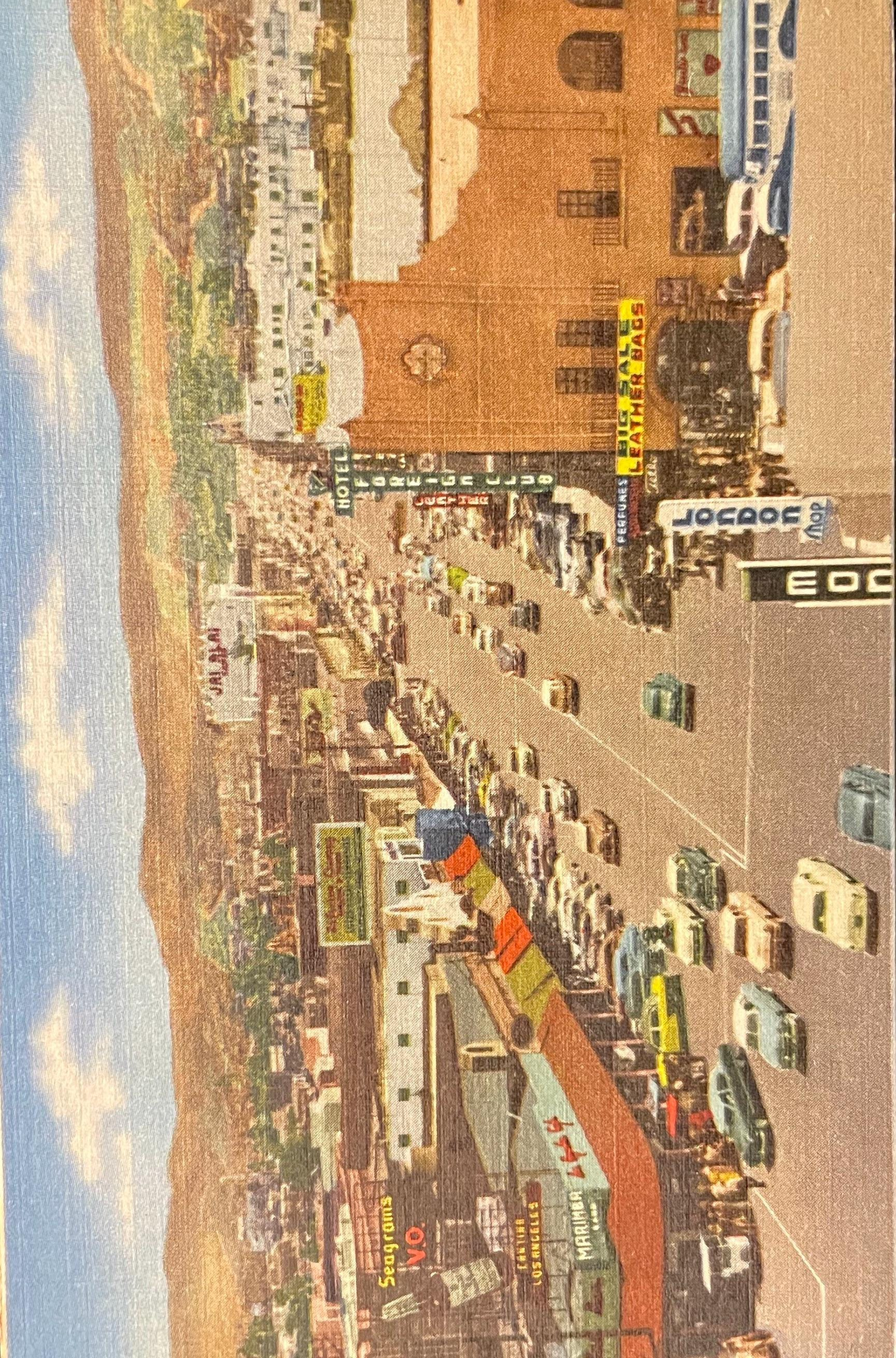 This postcard displays a Main Street in Tijuana, Mexico.