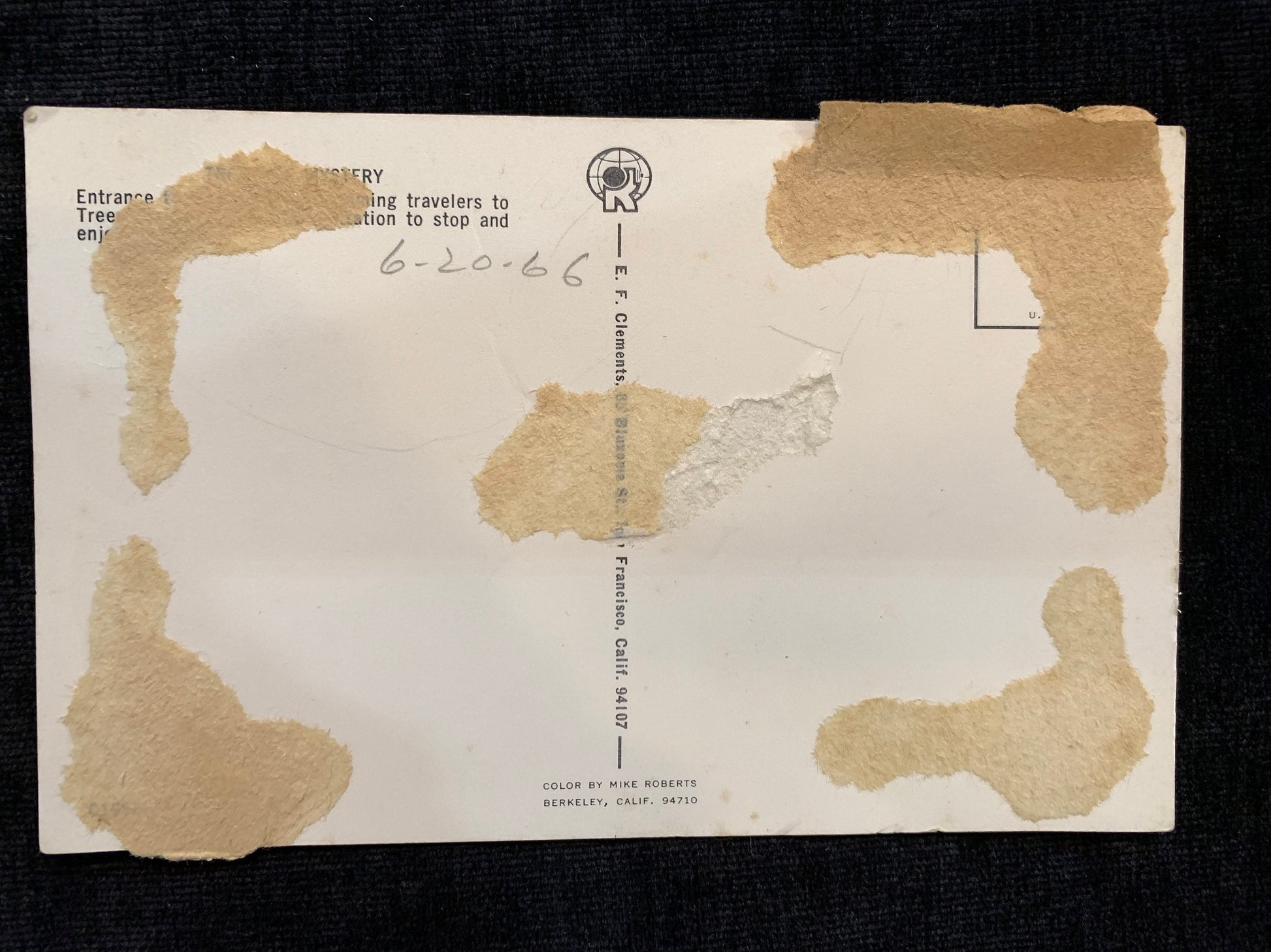 This postcard features a photograph of the entrance to the Trees of Mystery park in Klamath, California. The postcard is dated 6-20-66, but there is no other writing on the card. As can be seen in the photos, at one point this card was pasted into a scrapbook or album and was then removed, so there are paper remnants on the back and the back text is blocked by the paper.