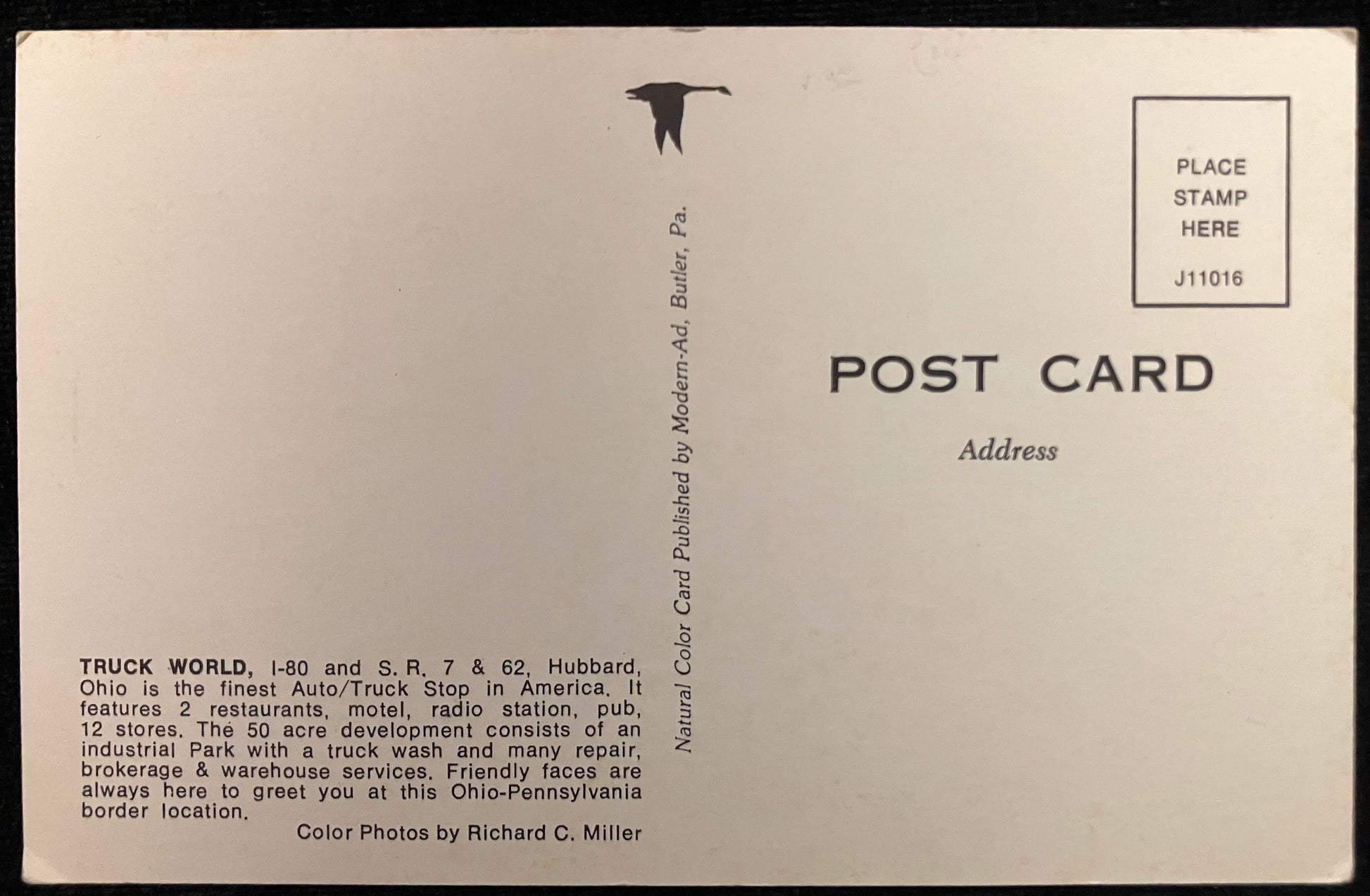 On back: Truck World, I-80 and S.R. 7 & 62, Hubbard, Ohio is the finest Auto/Truck Stop in America. It features 2 restaurants, motel, radio station, pub, 12 stores. The 50 acre development consists of an industrial Park with a truck wash and many repair, brokerage & warehouse services. Friendly faces are always here to greet you at this Ohio-Pennsylvania border location.