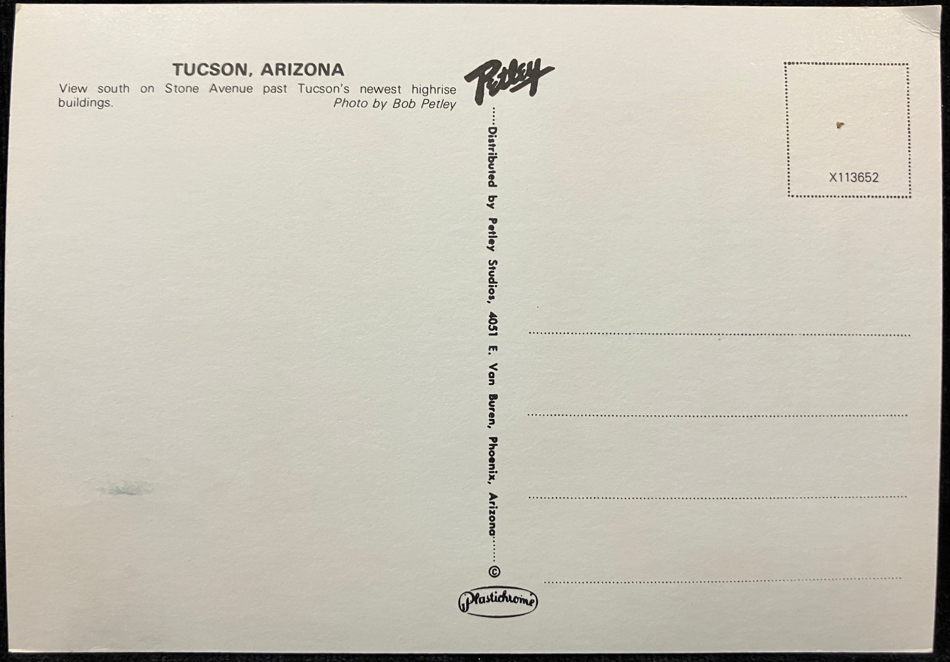 On back: TUCSON, ARIZONA View south on Stone Avenue past Tucson’s newest high rise buildings.