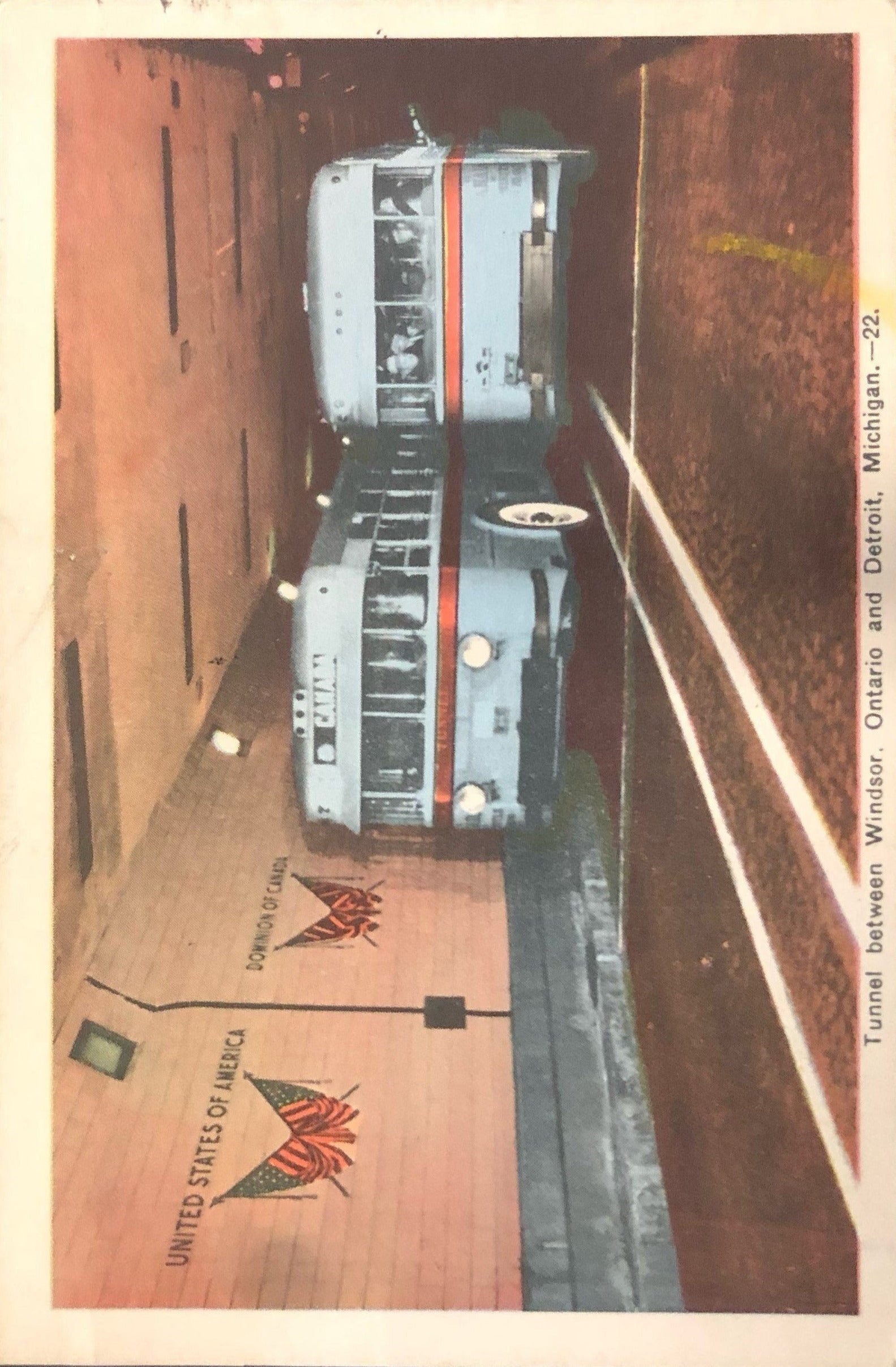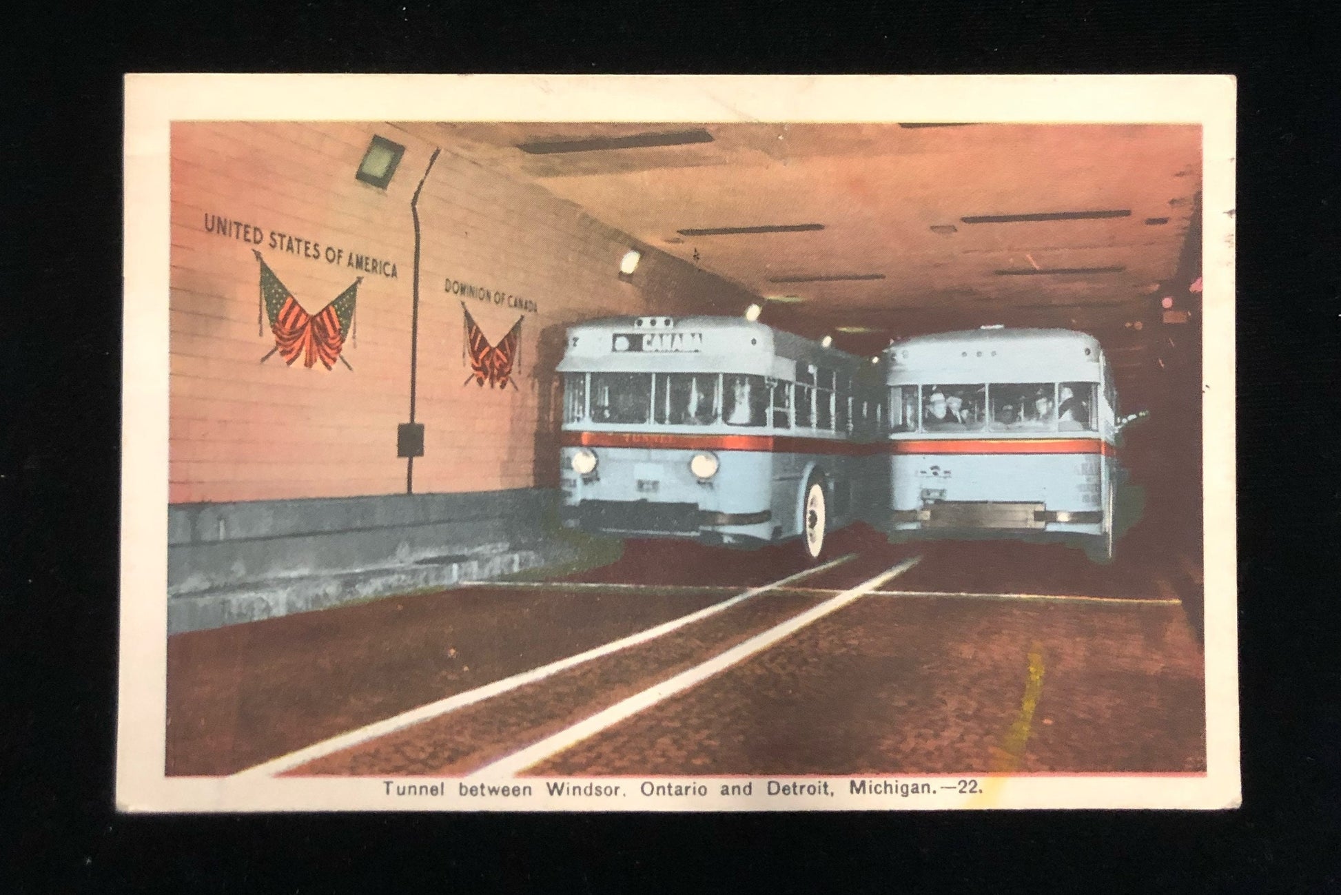 This 1940's vintage postcard depicts two buses in the tunnel crossing Canada and the USA.