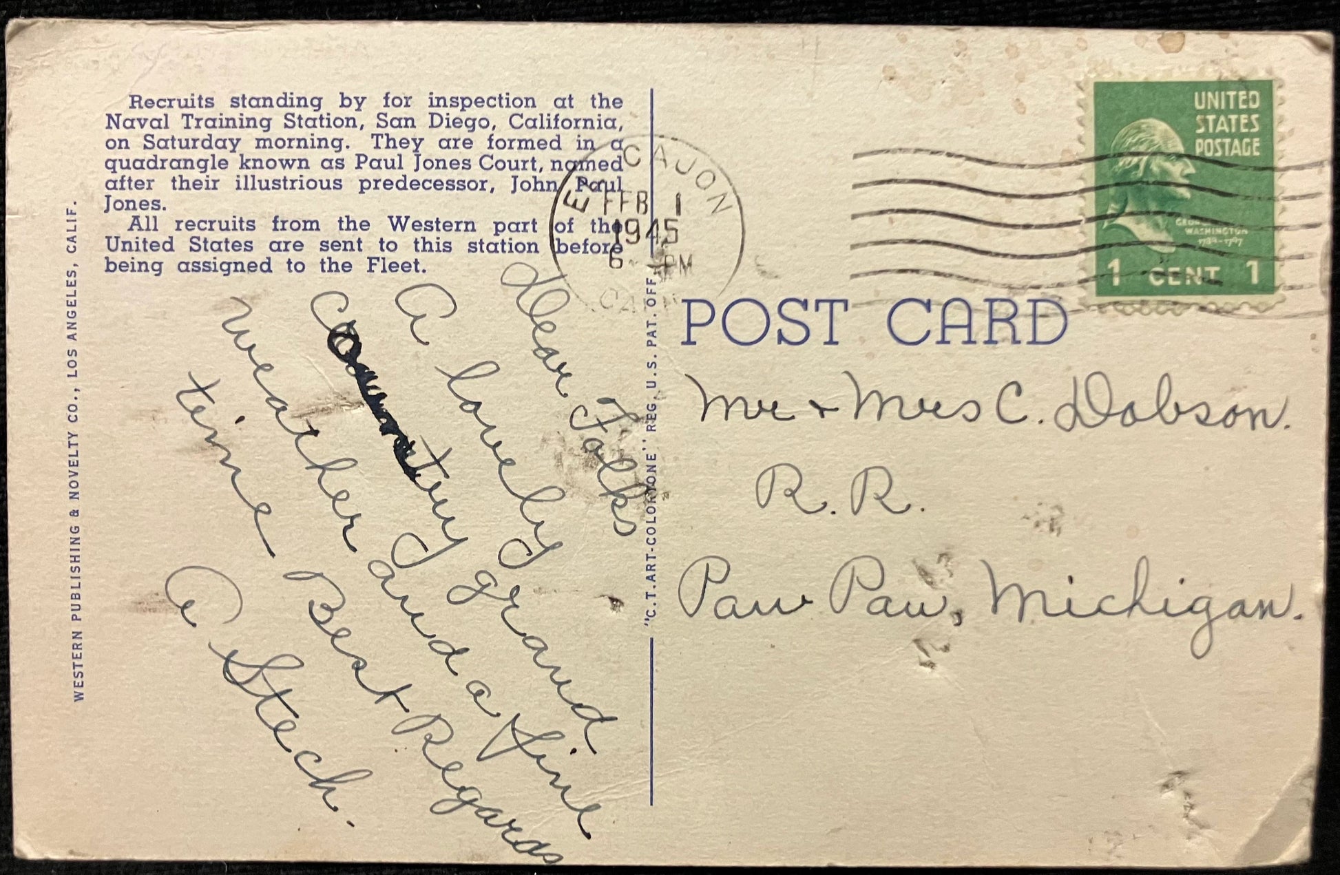 Mailed: Postmark Feb. 1st, 1945 El Cajon, California, green one cent George Washington stamp