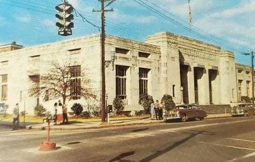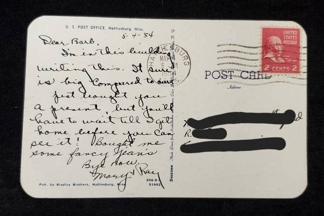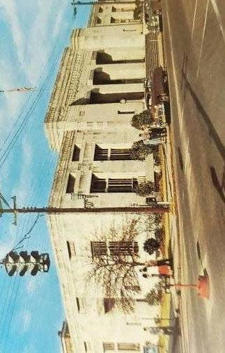 This card features the US Post Office in Hattiesburg, Mississippi, in the mid-1940s. It is a classical-style building, most likely built in the late 1930s with the aid of the WPA program. The USPS had stock architectural plans after WWI, which communities could use to build the style most fitting to their city plans. The USPS built post office buildings all over the United States, beginning in the 1920s.