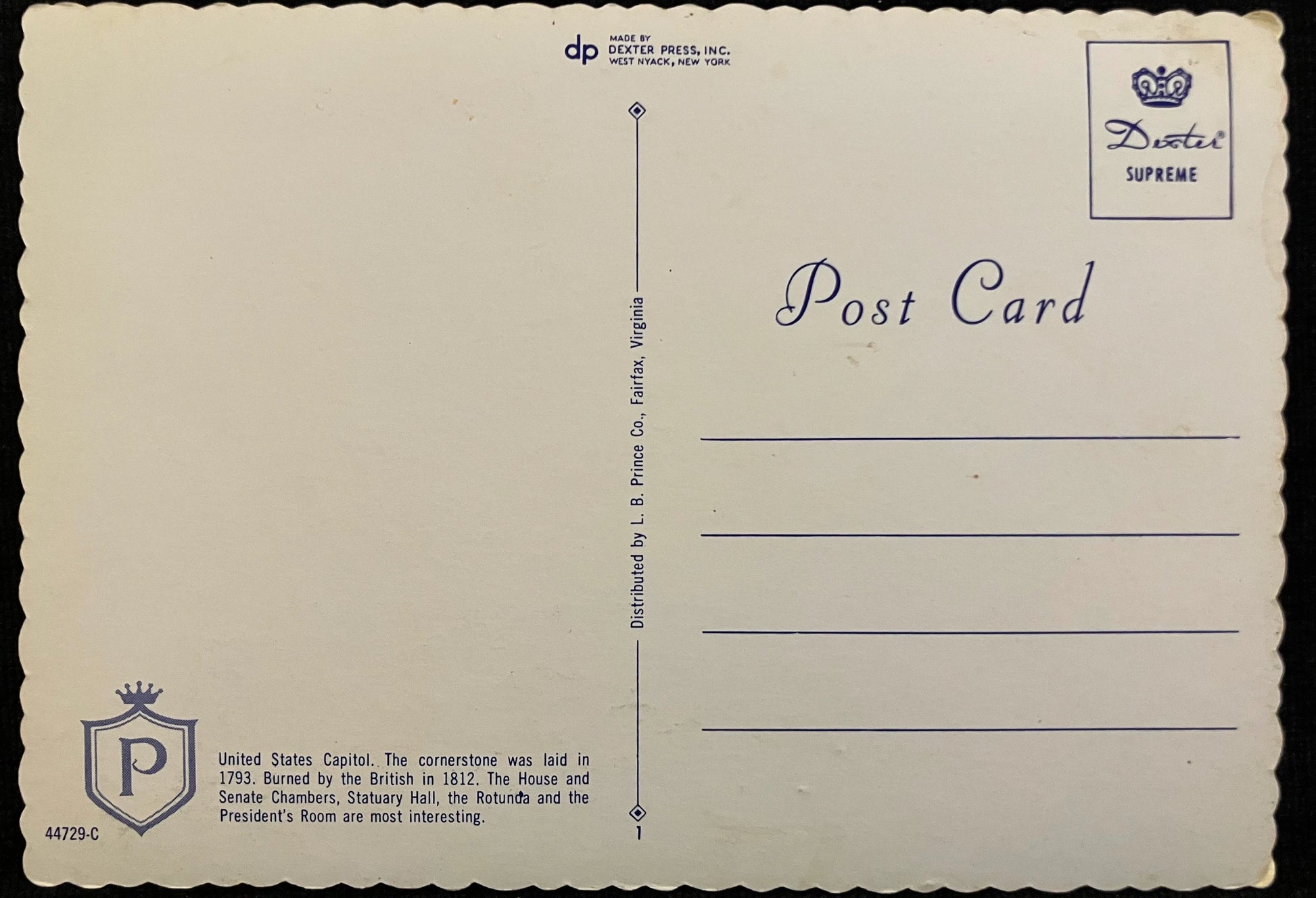 Back: United States Capitol. The Cornerstone was laid in 1793. Burned by the British in 1812. The House and Senate Chambers, Statuary Hall, the Rotunda and the President’s Room are most interesting.